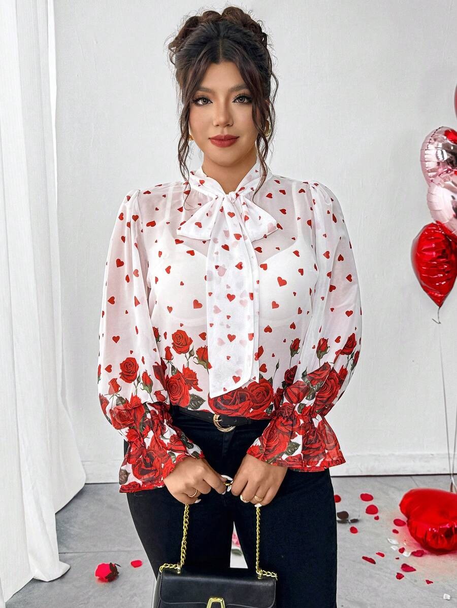 Camasa Dama Layla Alba cu Inimioare Rosii si Trandafiri – Marimi Mari