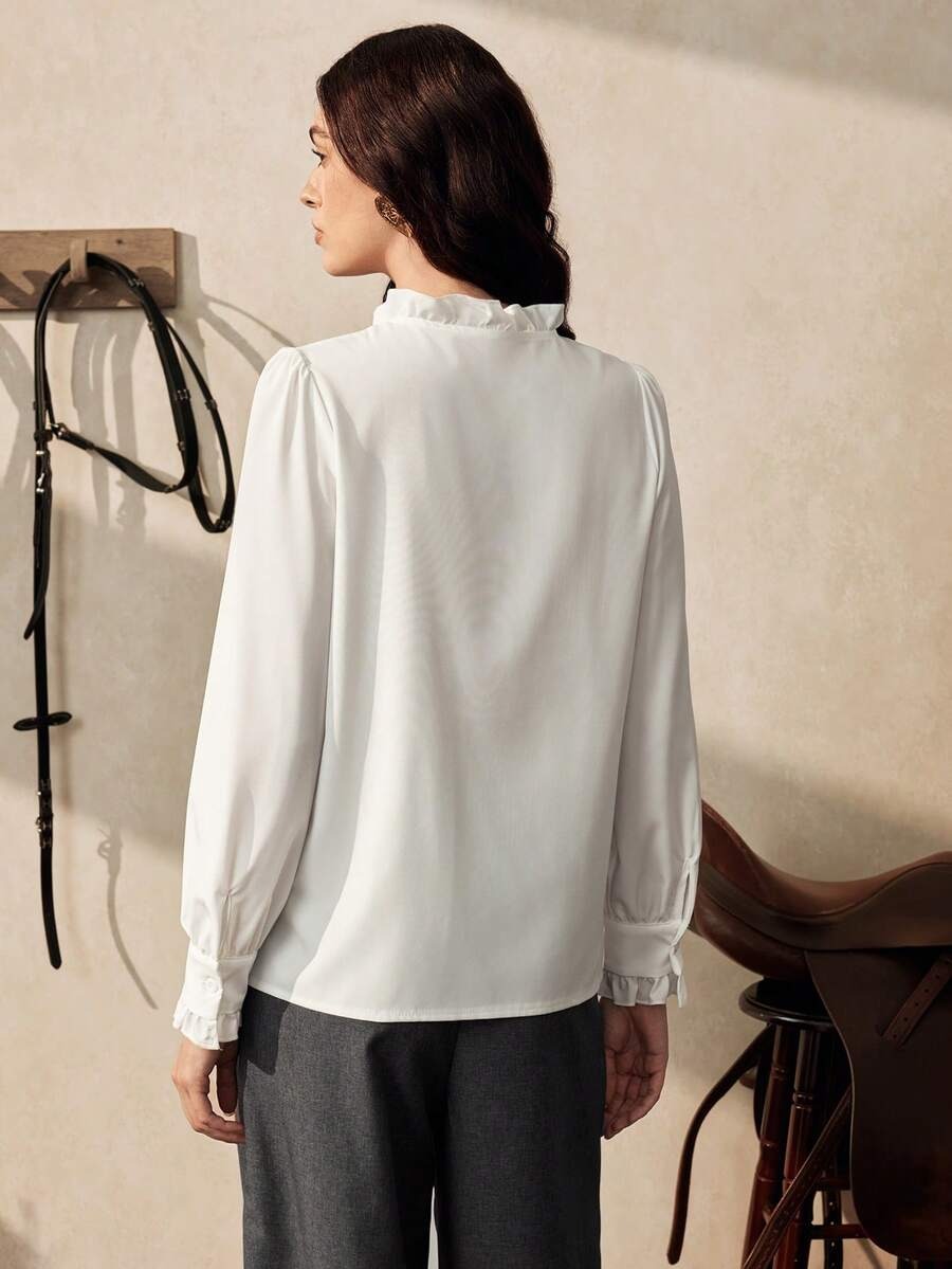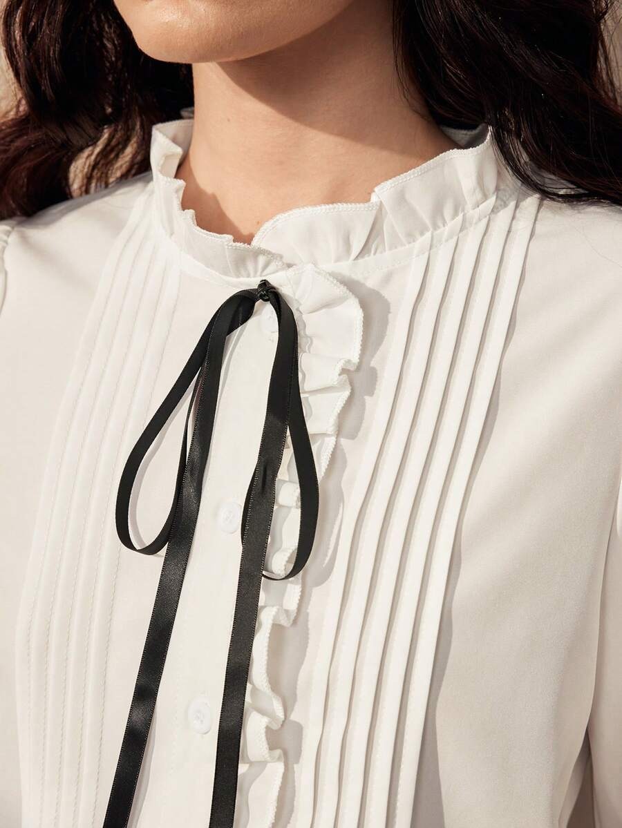Cămașa „Fiona” îmbină stilul clasic cu detalii feminine rafinate. Realizată dintr-o țesătură albă fină, această piesă se remarcă prin gulerul cu volănașe, cutele verticale în zona bustului și panglica neagră decorativă, ce adaugă un contrast subtil și elegant. Manșetele bufante cu volane completează armonios look-ul romantic și sofisticat.