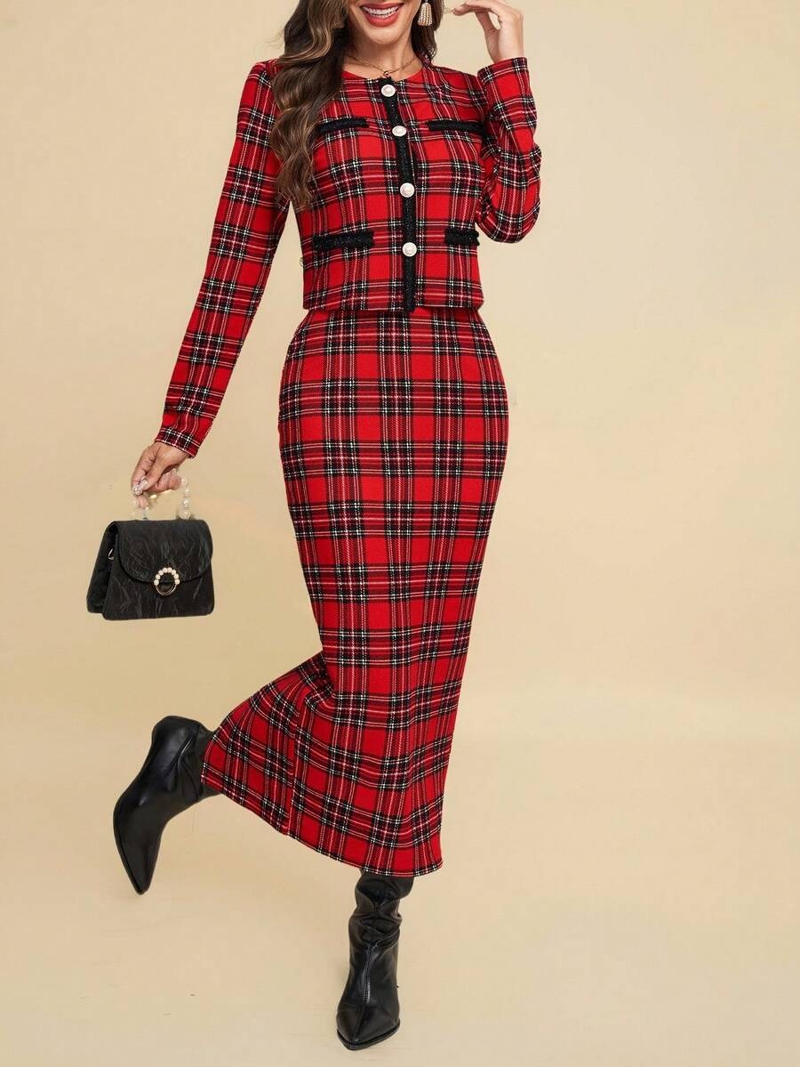 Compleu cu Fusta Midi Jannik Rosu cu Print Geometric Negru si Alb