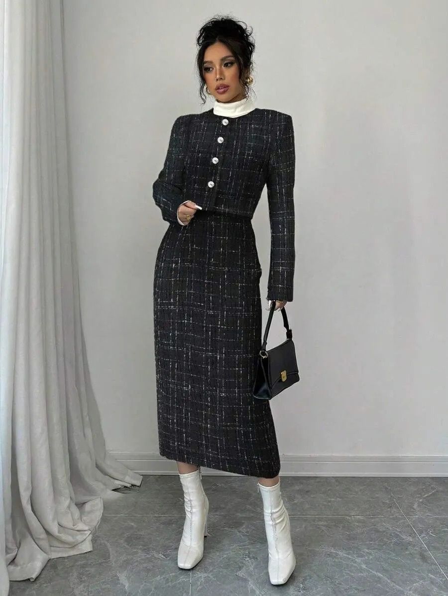 Compleu cu Fusta Midi Zina Negru cu Print Geometric Alb