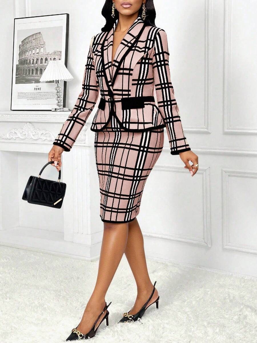 Compleu cu Fusta Scurta Alberta Roz cu Print Geometric Negru – Marimi Mari