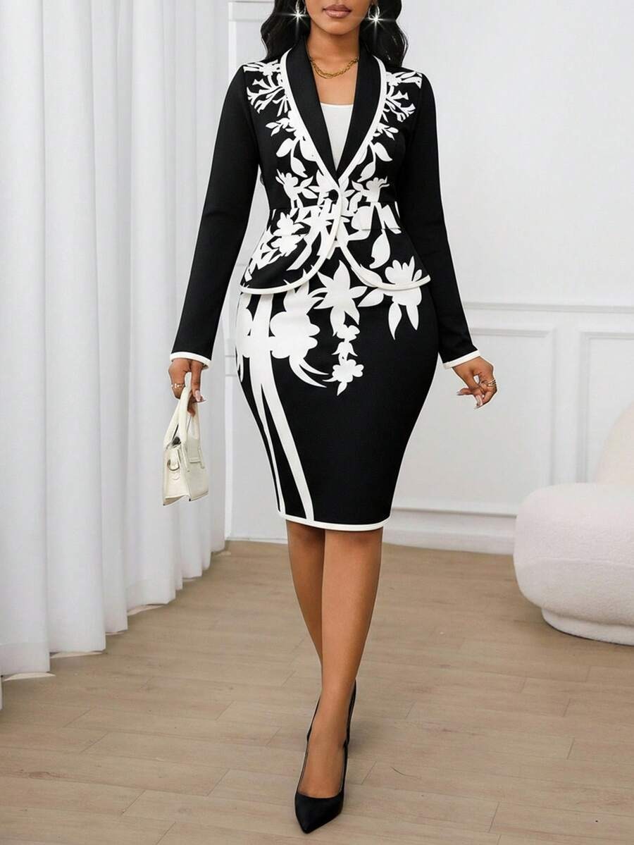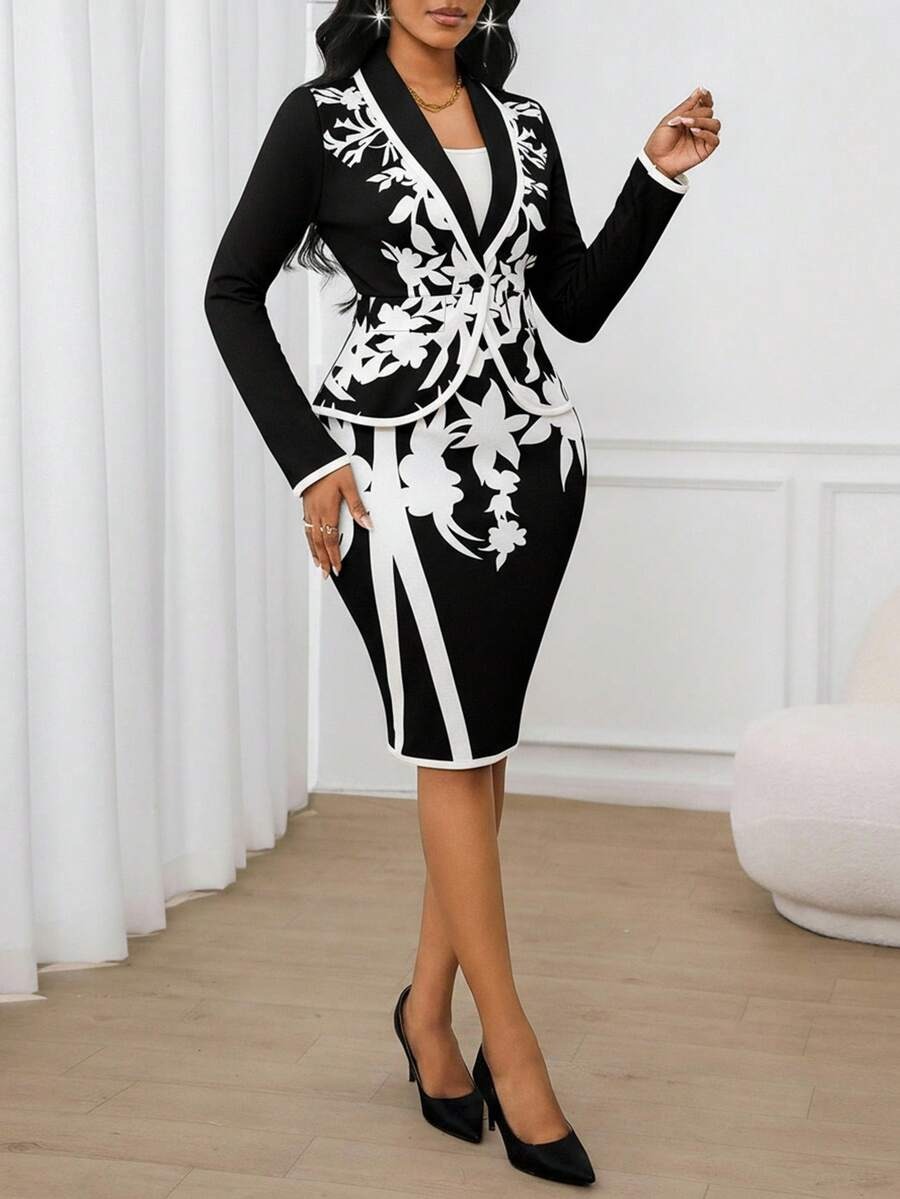 Compleu cu Fusta Scurta Serena Negru cu Print Floral Alb