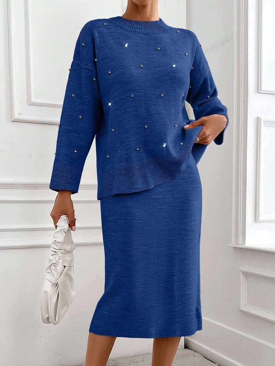Compleu Tricotat cu Fusta Midi Daniella Albastru cu Strasuri