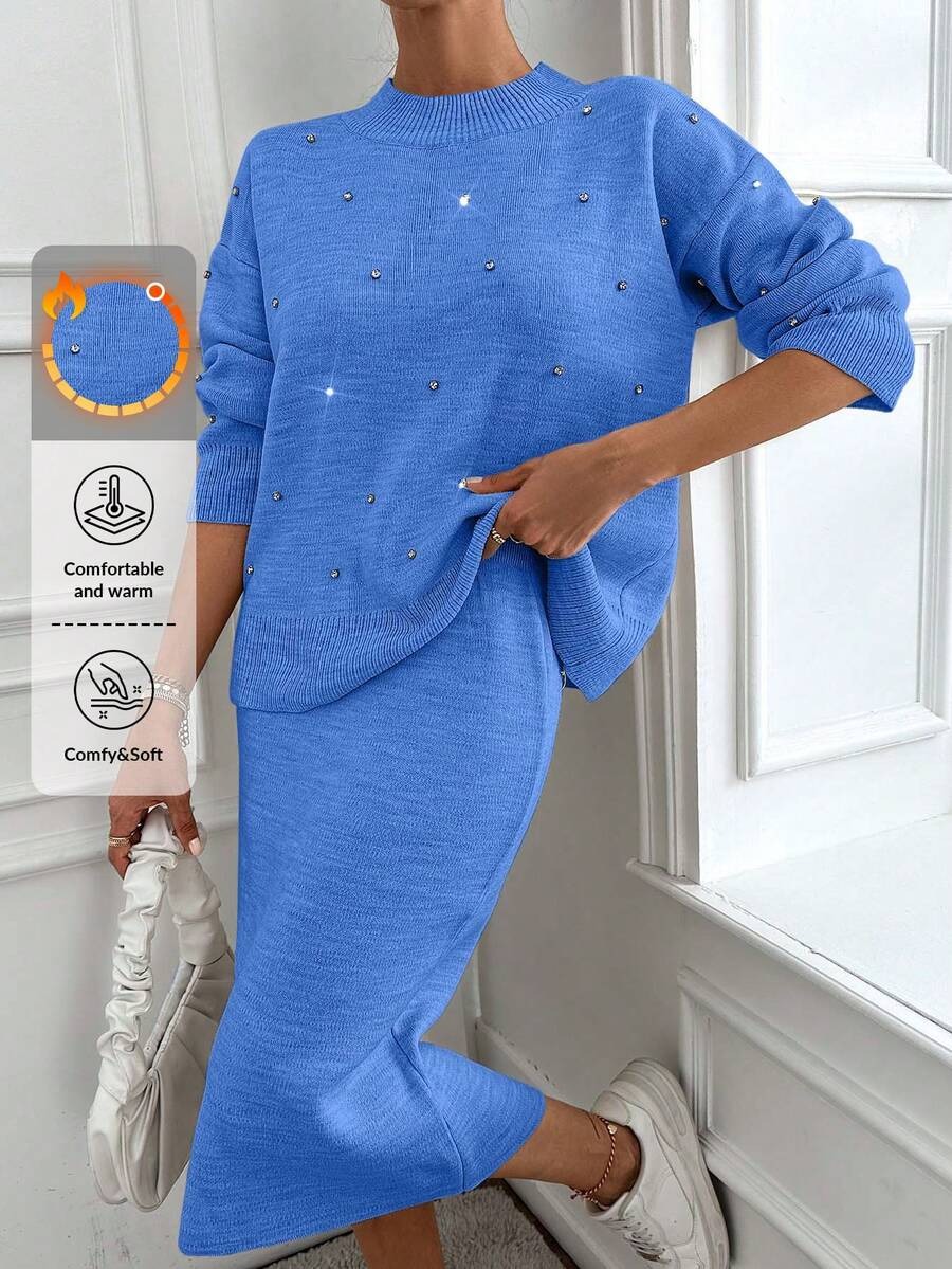 Compleu Tricotat cu Fusta Midi Daniella Bleu cu Strasuri