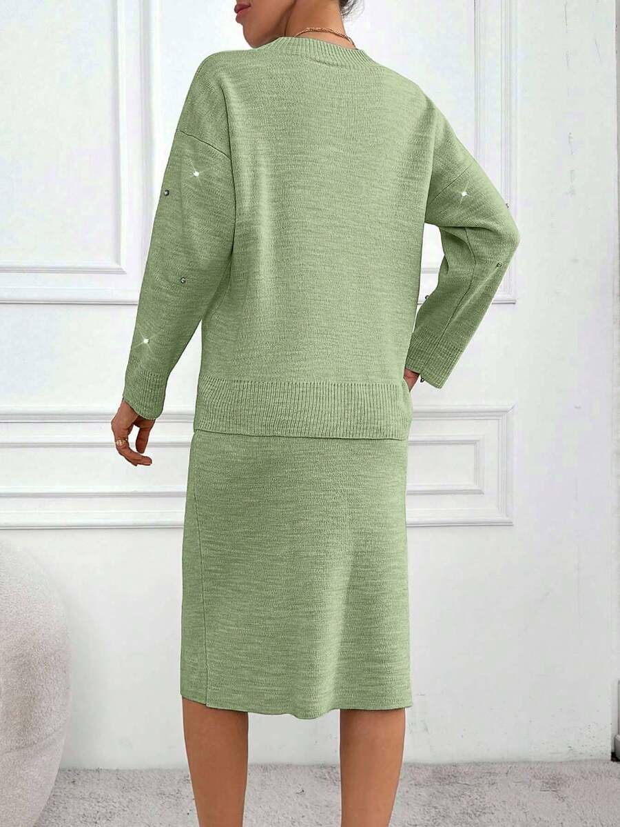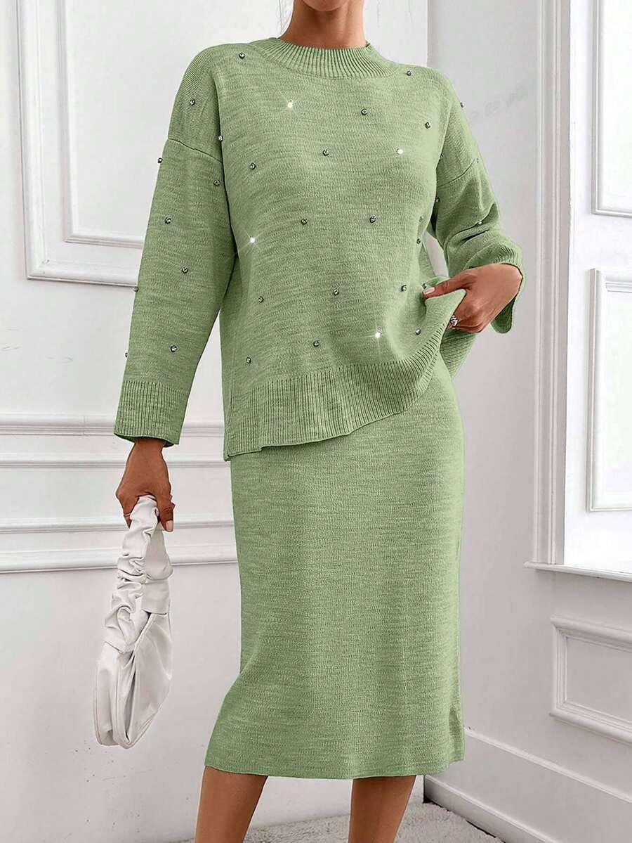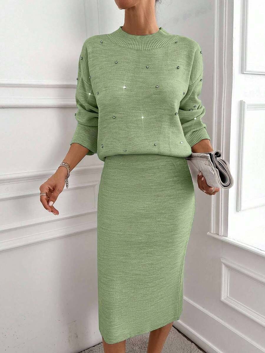 Compleu Tricotat cu Fusta Midi Daniella Vernil cu Strasuri