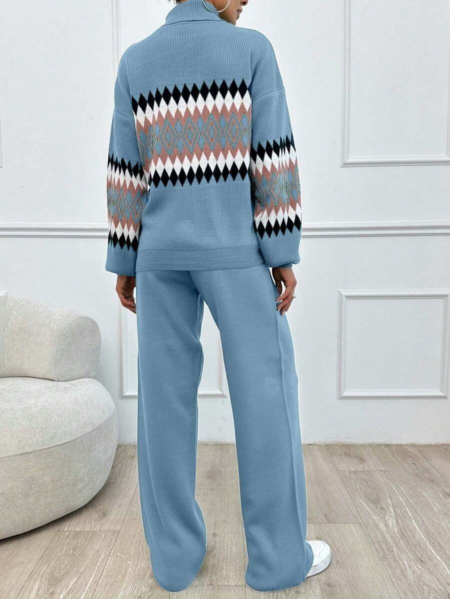 Compleu Tricotat cu Pantalon Cosima Bleu cu Print Geometric