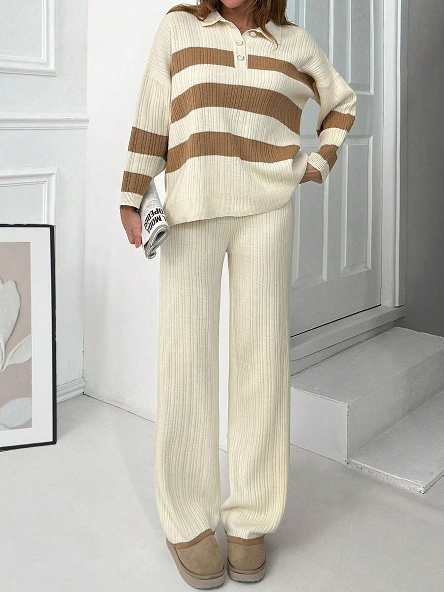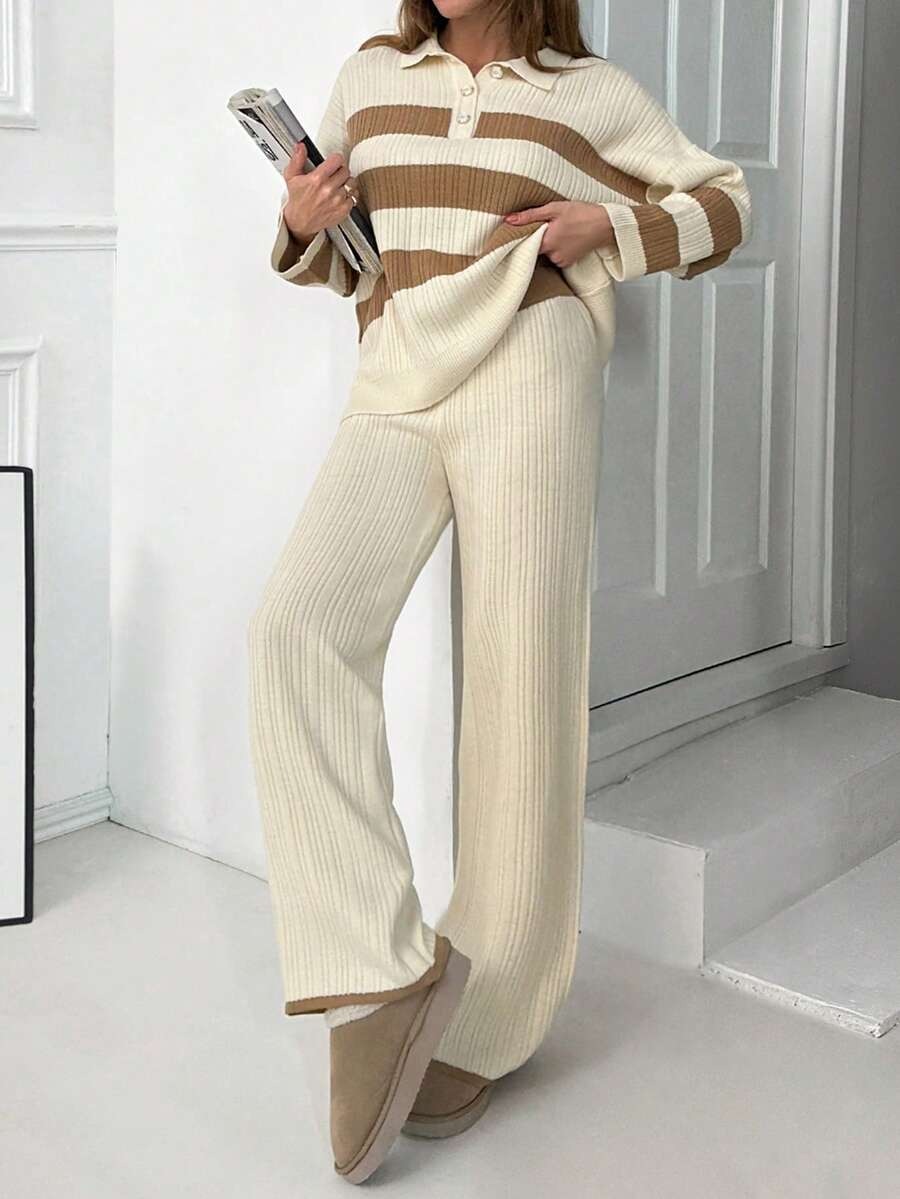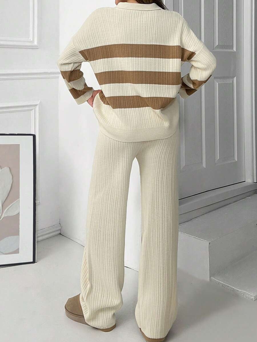 Compleu Tricotat cu Pantalon Daria Crem cu Dungi Maro