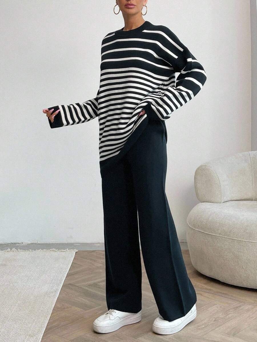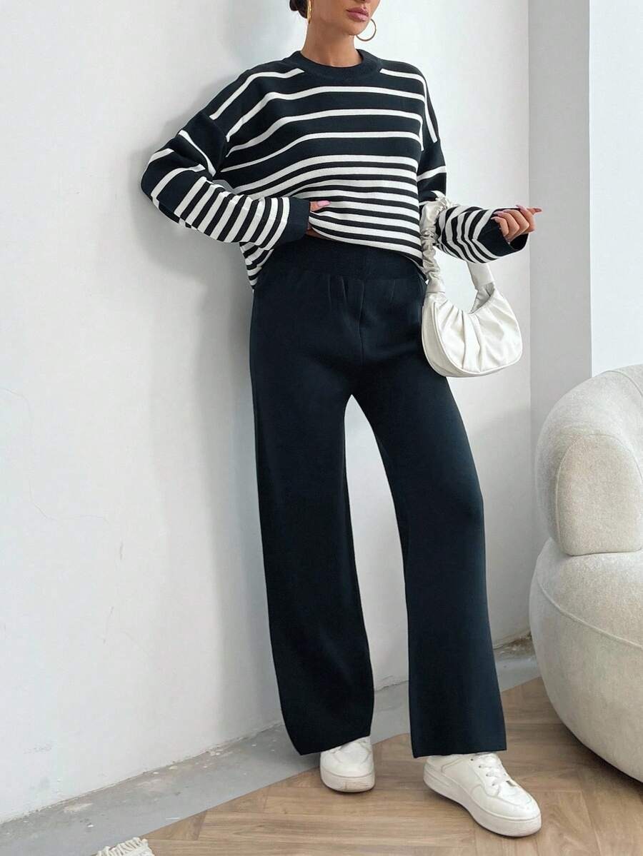 Compleu Tricotat cu Pantalon Donda Gri cu Dungi Albe