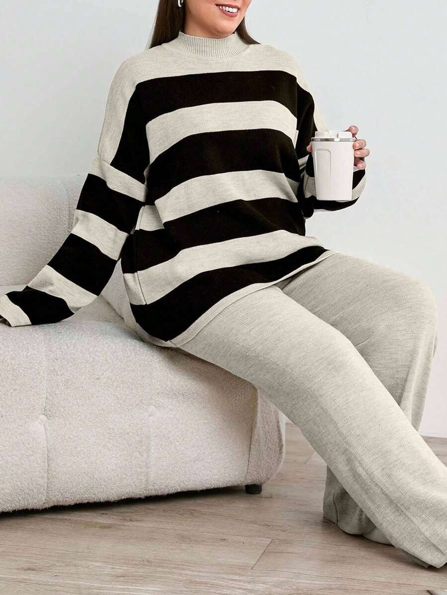 Compleu Tricotat cu Pantalon Eniko Gri cu Dungi Negre – Marimi Mari
