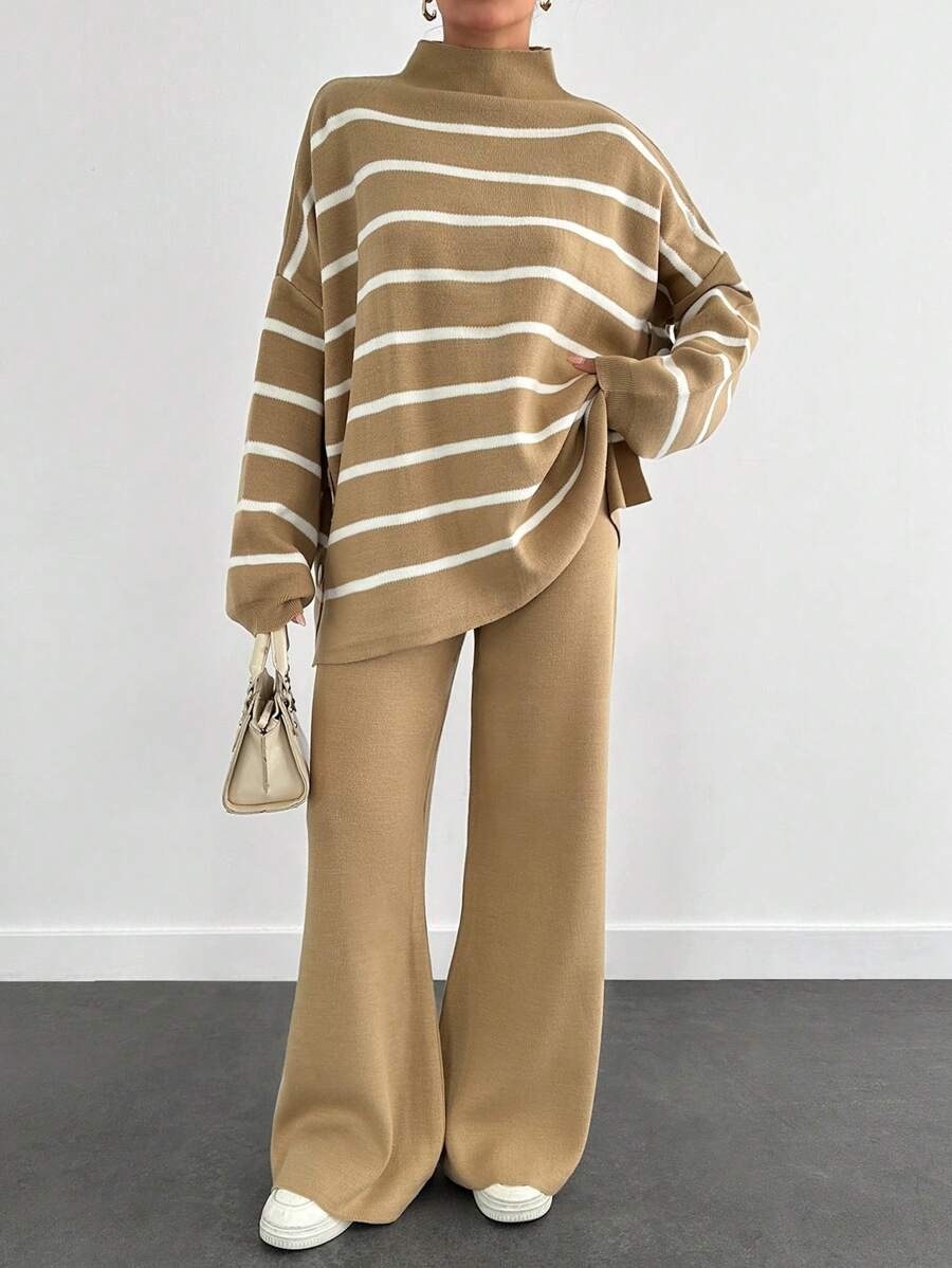 Compleu Tricotat cu Pantalon Iren Bej cu Dungi Albe