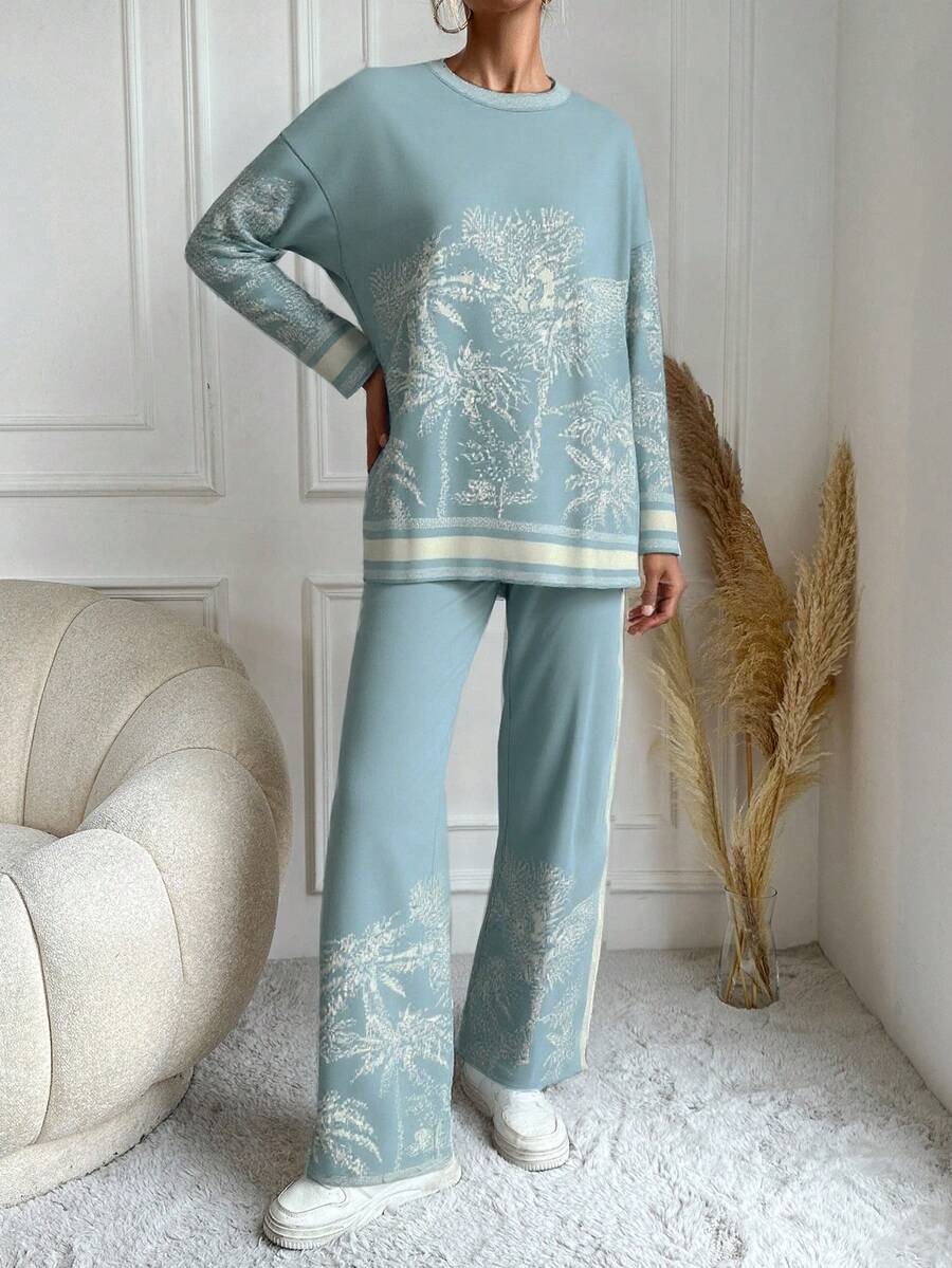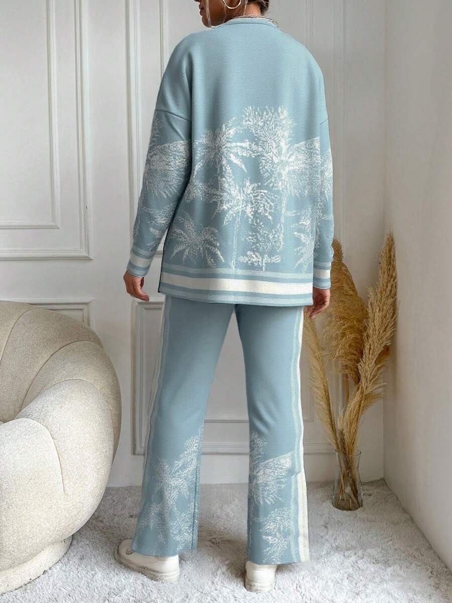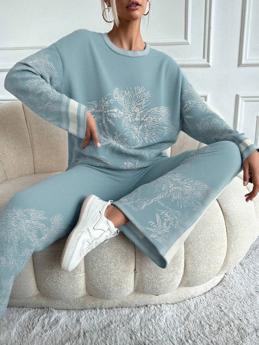 Compleu Tricotat cu Pantalon Jeniss Bleu cu Print Alb
