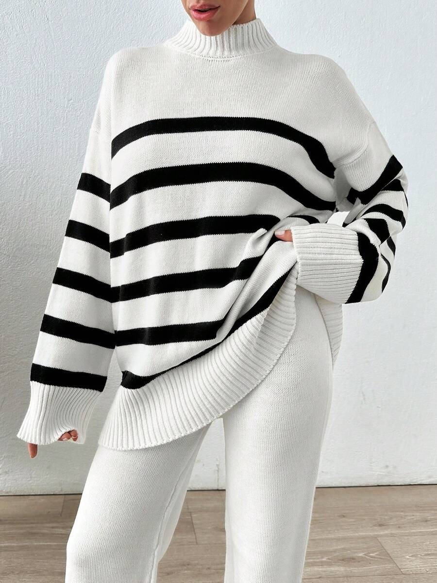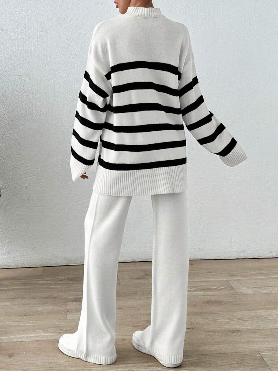 Compleu Tricotat cu Pantalon Karsten Alb cu Dungi Negre