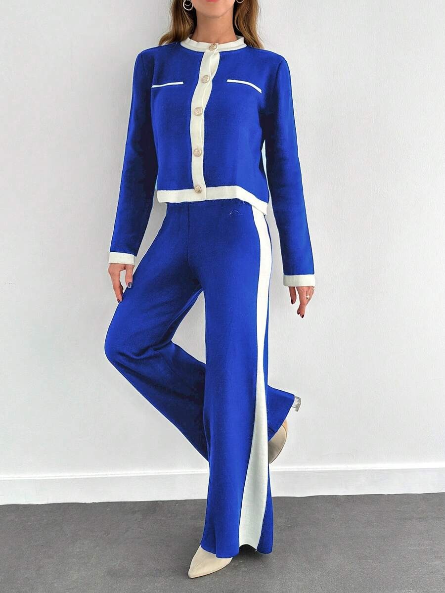 Compleu Tricotat cu Pantalon Lucia Albastru cu Dungi Albe