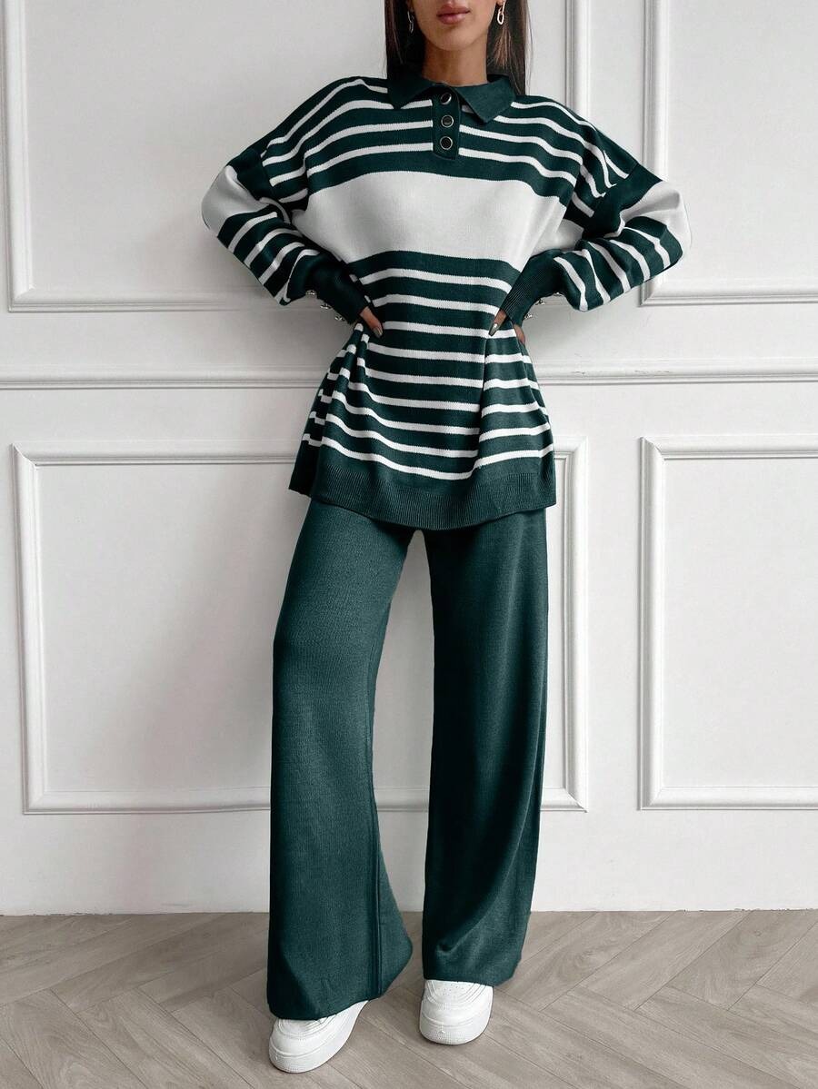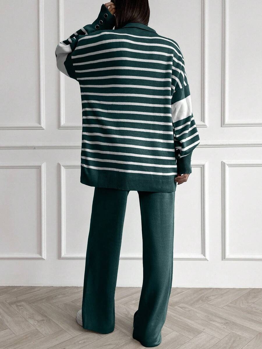 Compleu Tricotat cu Pantalon Patricia Verde Inchis cu Dungi Albe