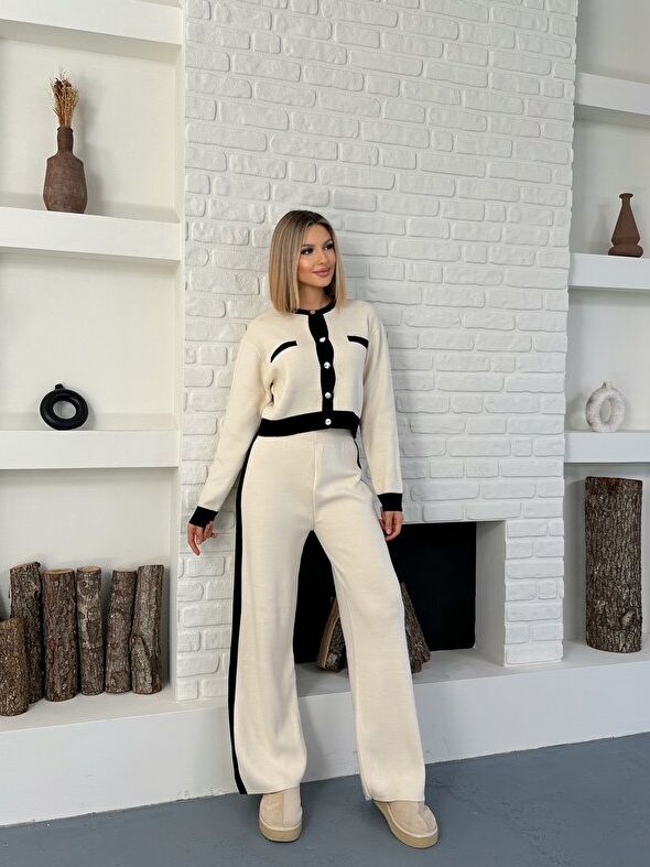 Compleu Tricotat cu Pantalon Rally Crem cu Dungi Negre