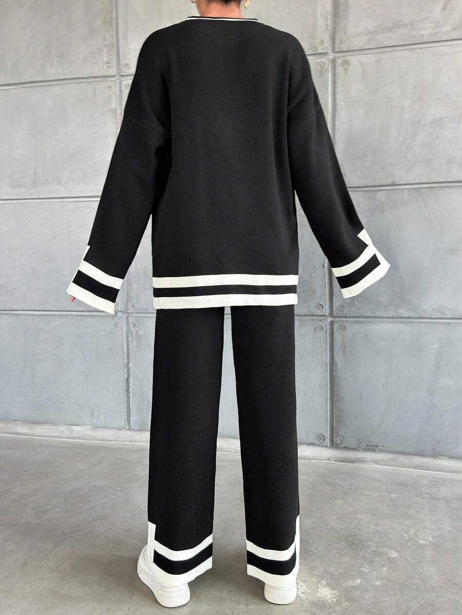 Compleu Tricotat cu Pantalon Rora Negru cu Dungi Albe