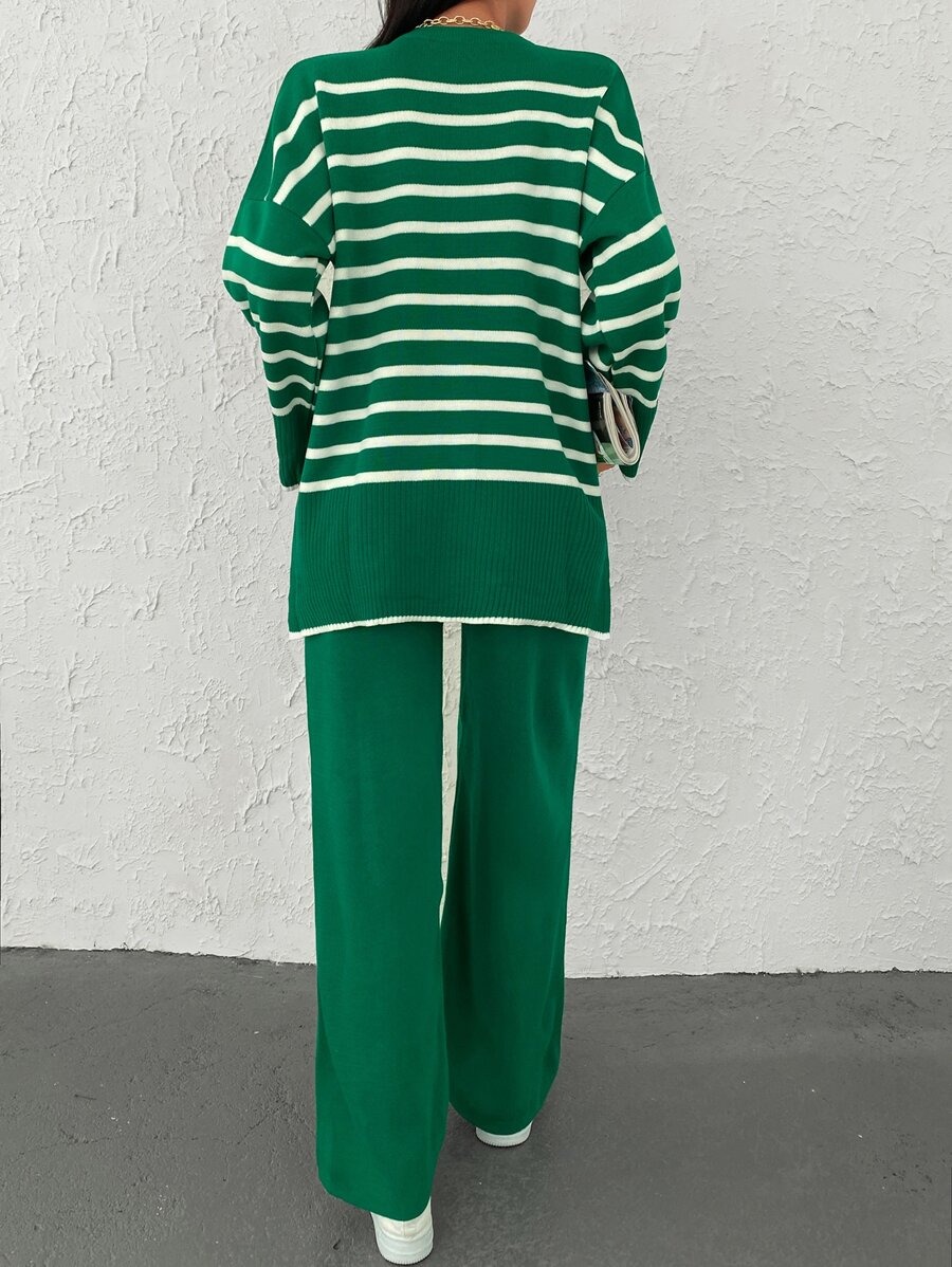 Compleu Tricotat cu Pantalon Zinna Verde cu Dungi Albe