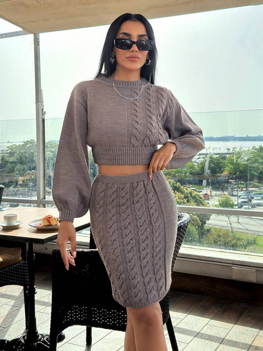 Compleu Tricotat Rosita Bej Inchis cu Fusta Scurta
