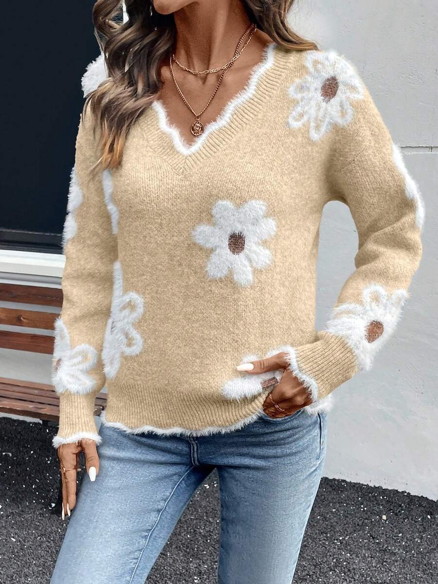 Pulover Tricotat Alexia Crem cu Flori Albe