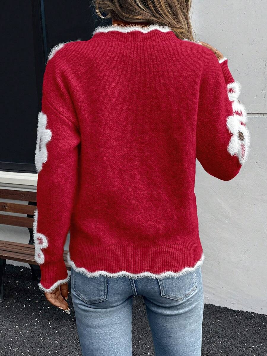 Pulover Tricotat Alexia Rosu cu Flori Albe