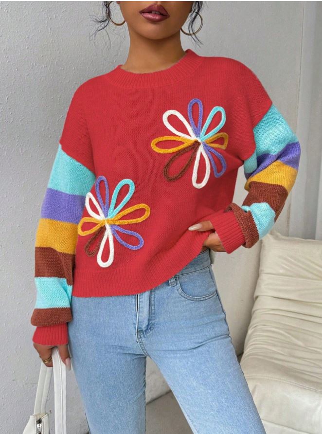 Pulover Tricotat Denisa Rosu cu Dungi Multicolore