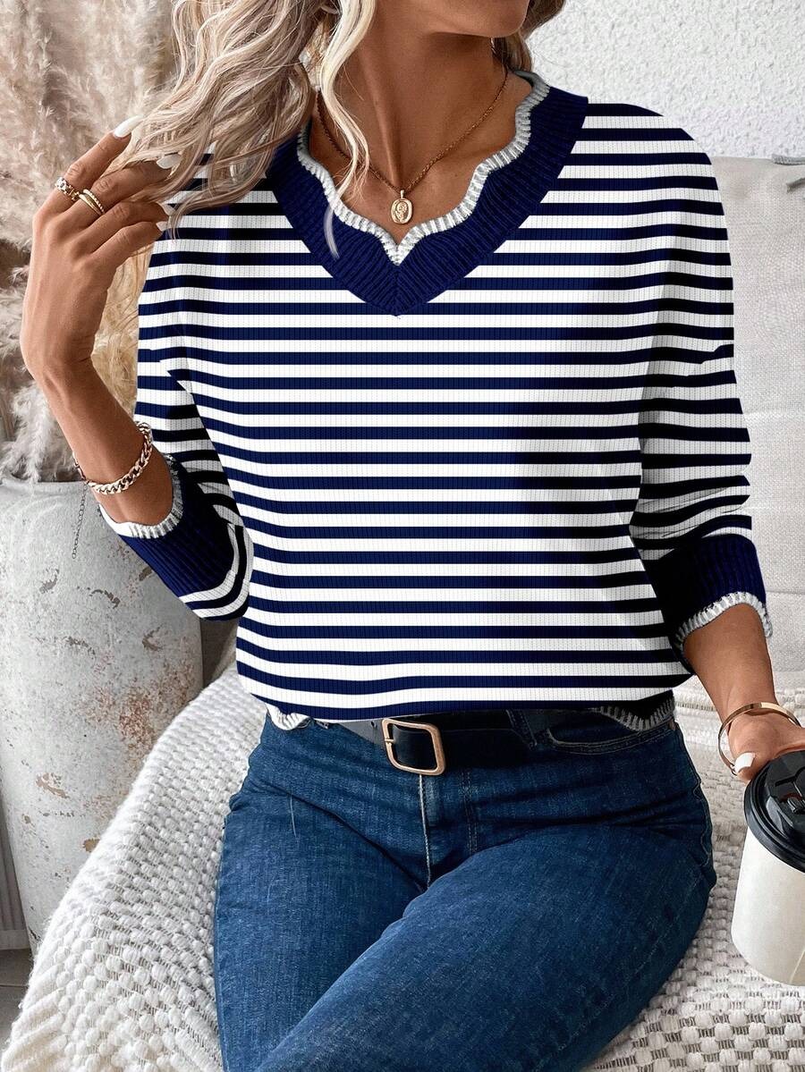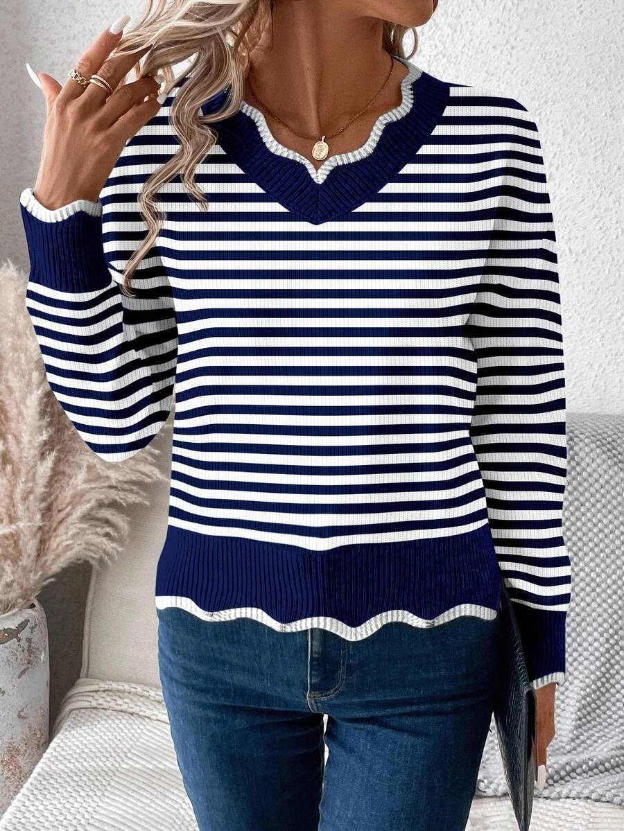 Pulover Tricotat Elisa Albastru cu Dungi Albe