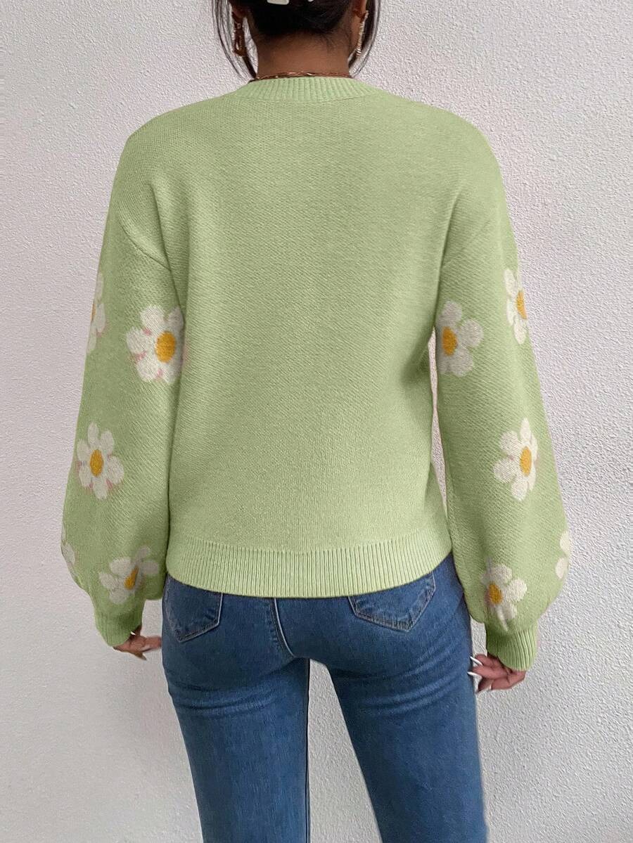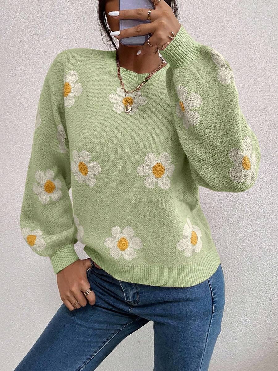 Pulover Tricotat Flavia Vernil cu Flori Albe