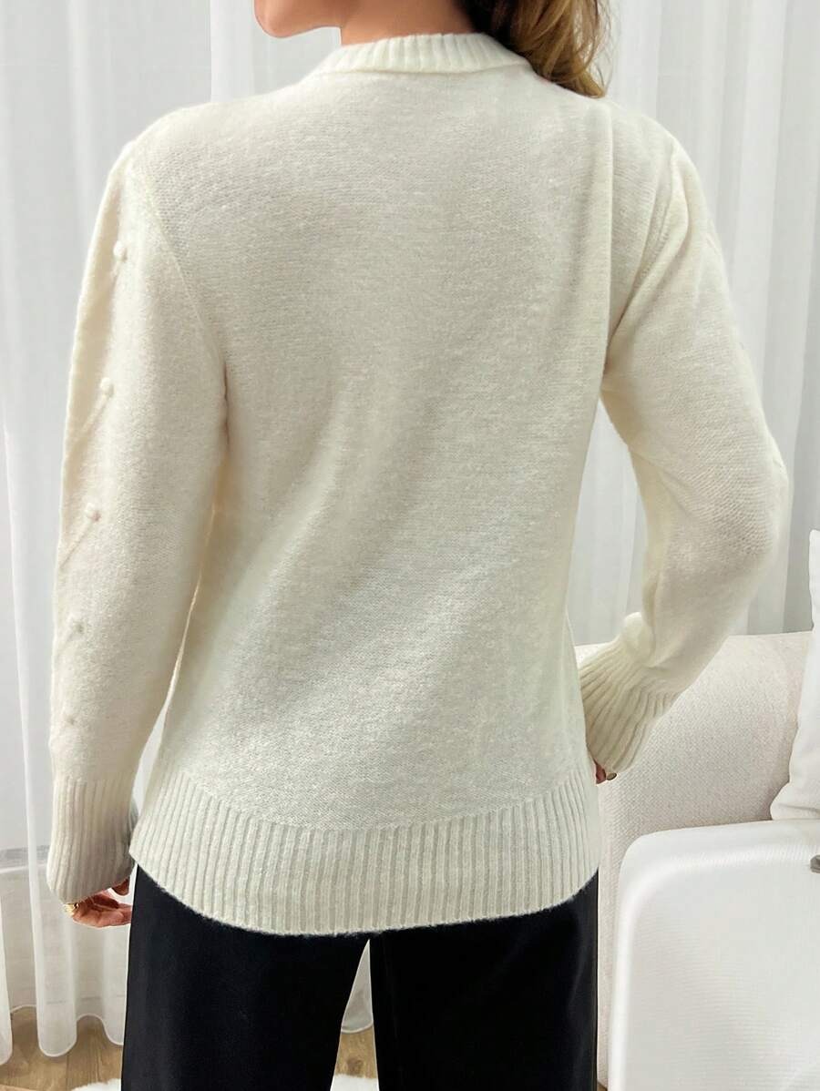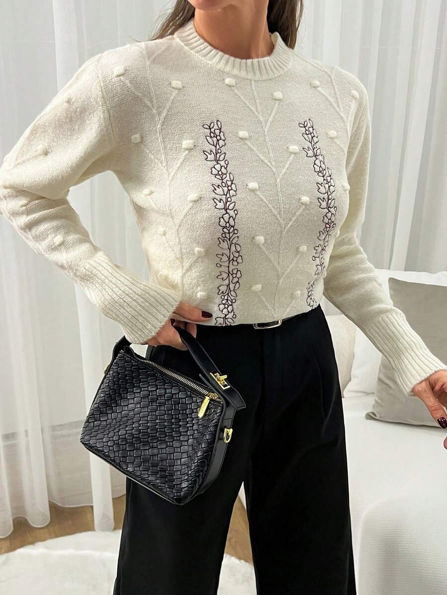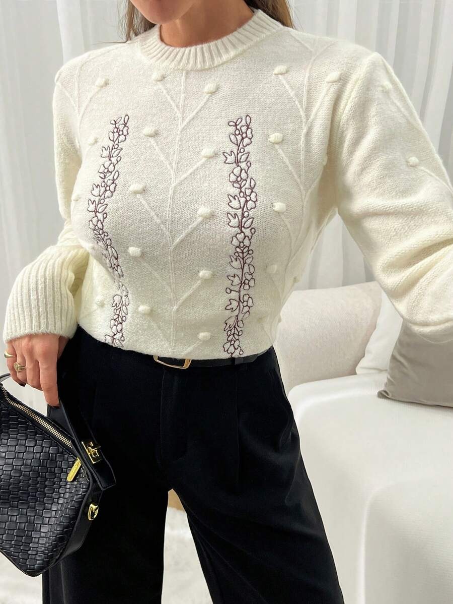 Pulover Tricotat Narely Bej cu broderie