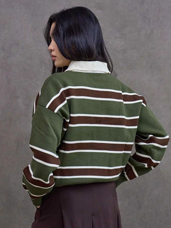 Pulover Tricotat Ralia Kaki cu Dungi Maro si Albe