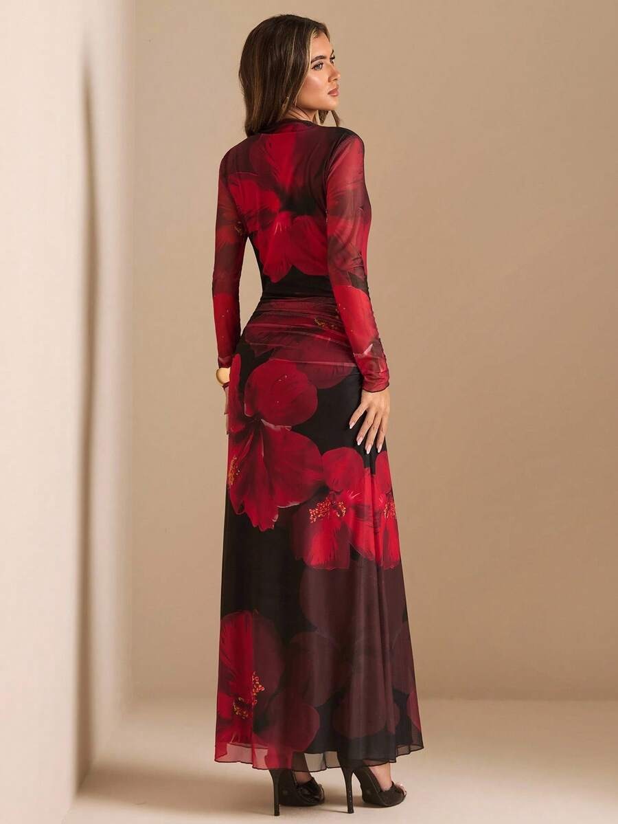 Rochie Lunga Adnana Neagra cu Print Floral Rosu