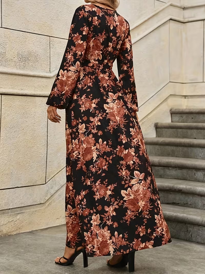 Rochie Lunga Asra Neagra cu Print Floral Maro