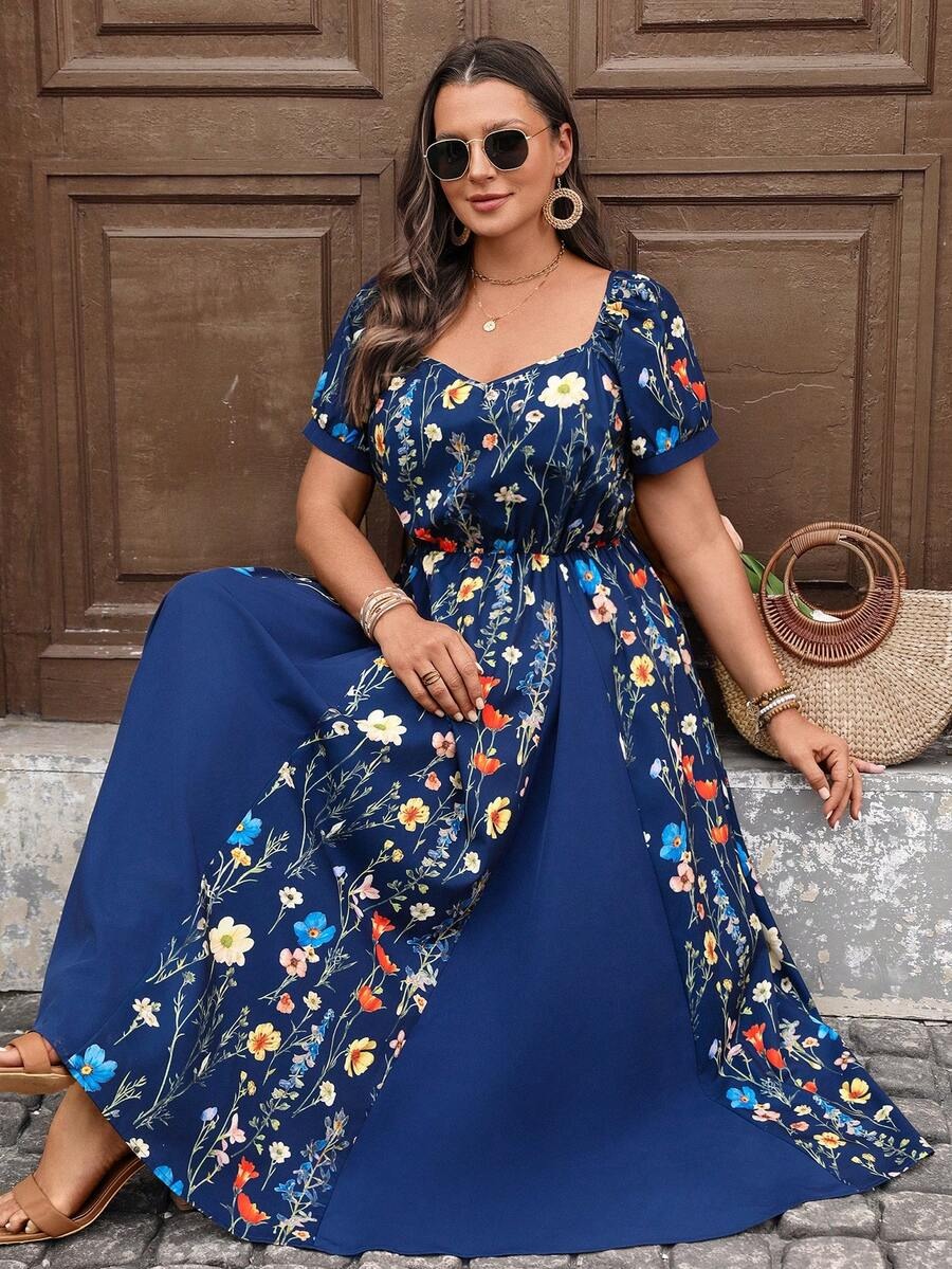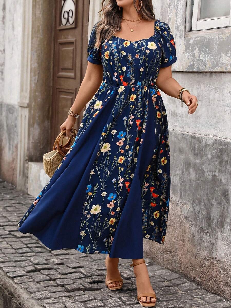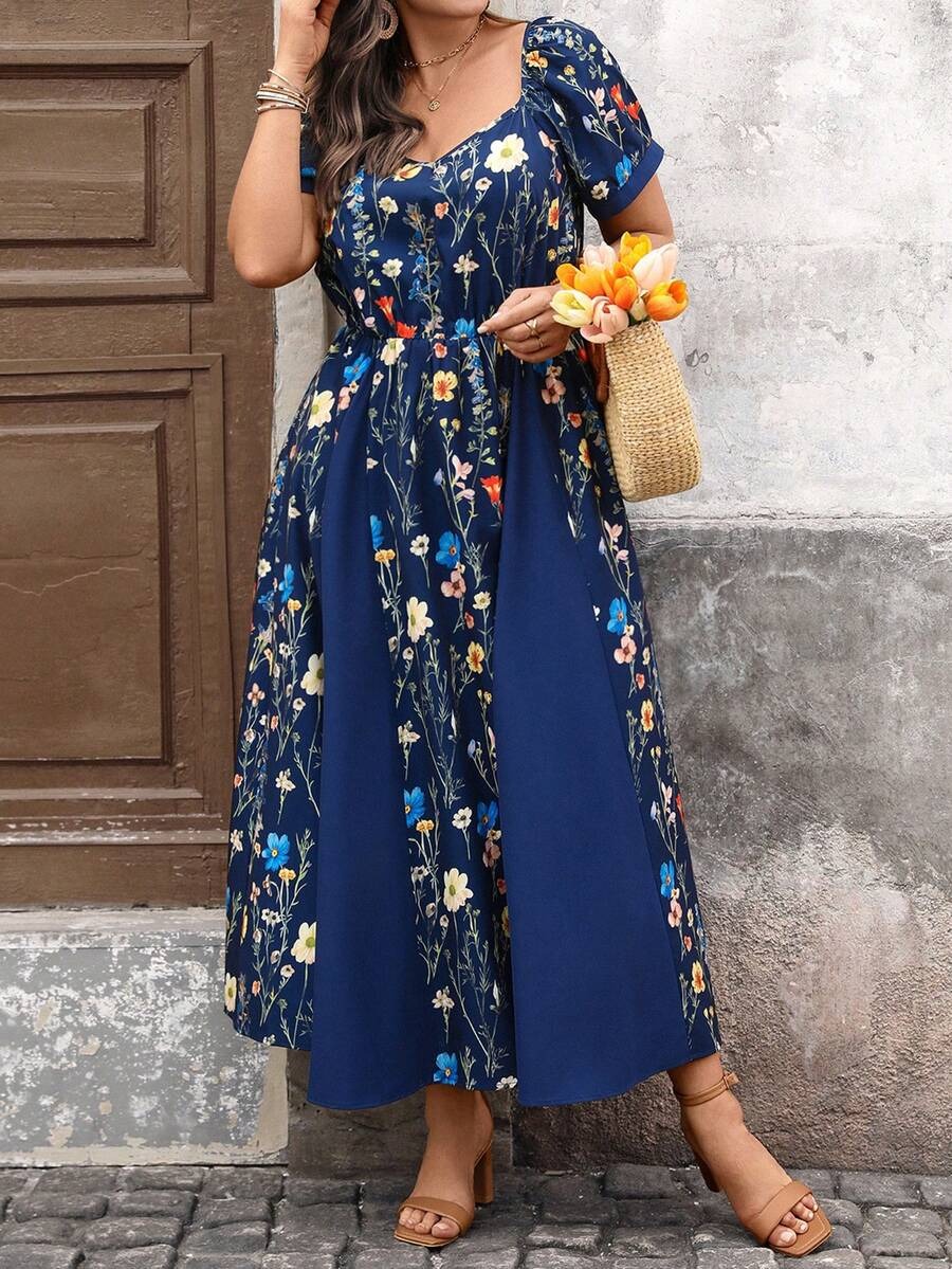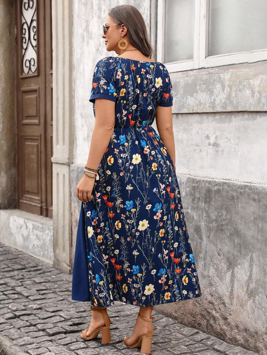 Rochie Lunga Bertha Bleumarin cu Print Floral Multicolor – Marimi Mari
