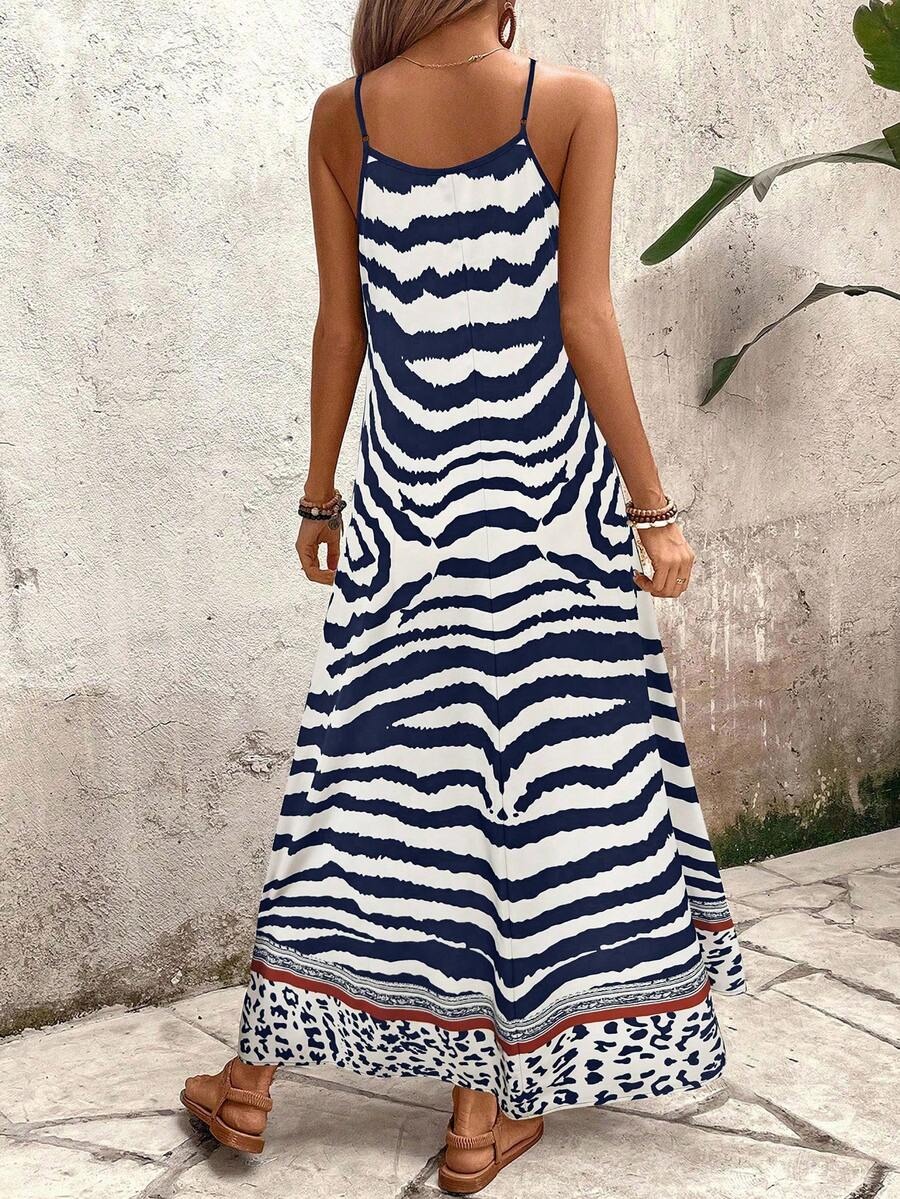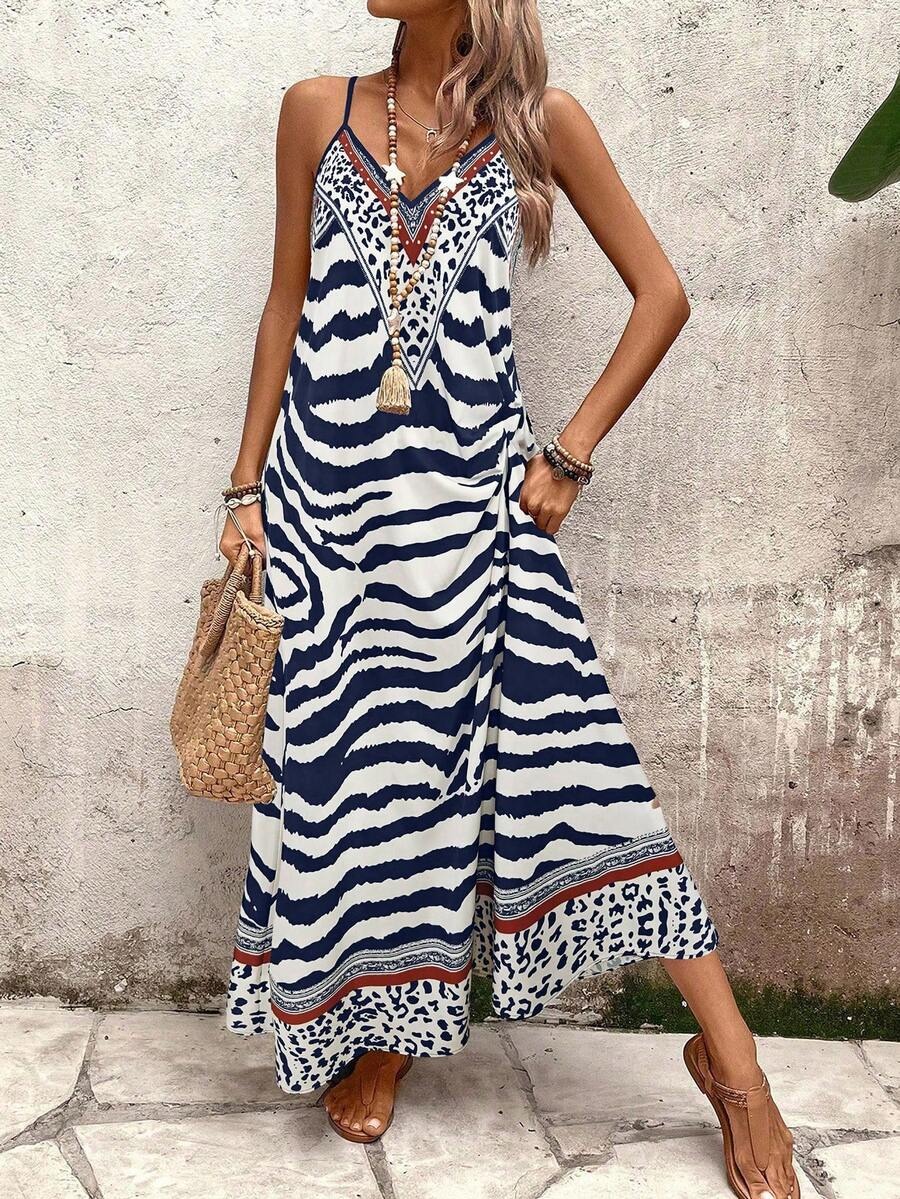 Rochie Lunga Brenda Alba cu Print Bleumarin