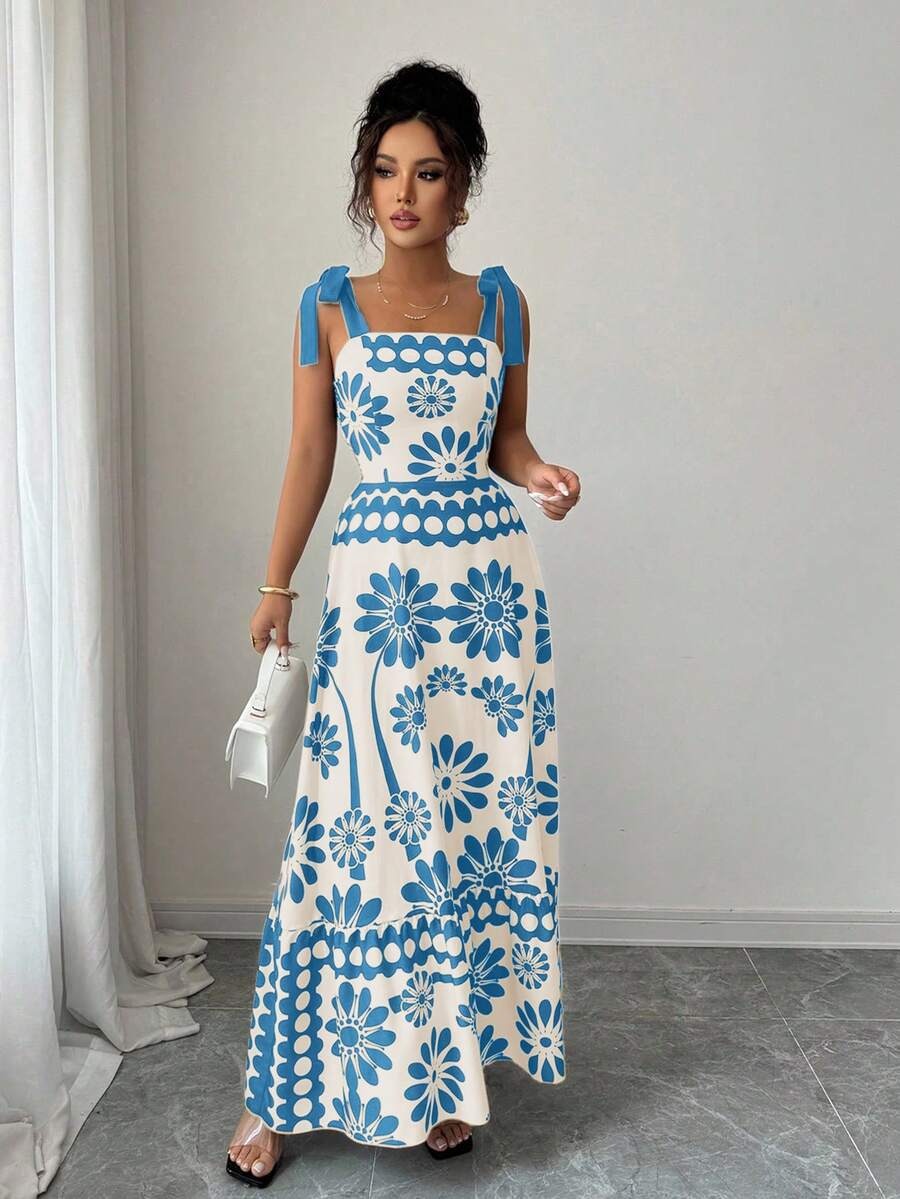 Rochie Lunga Carlisa Crem cu Print Albastru