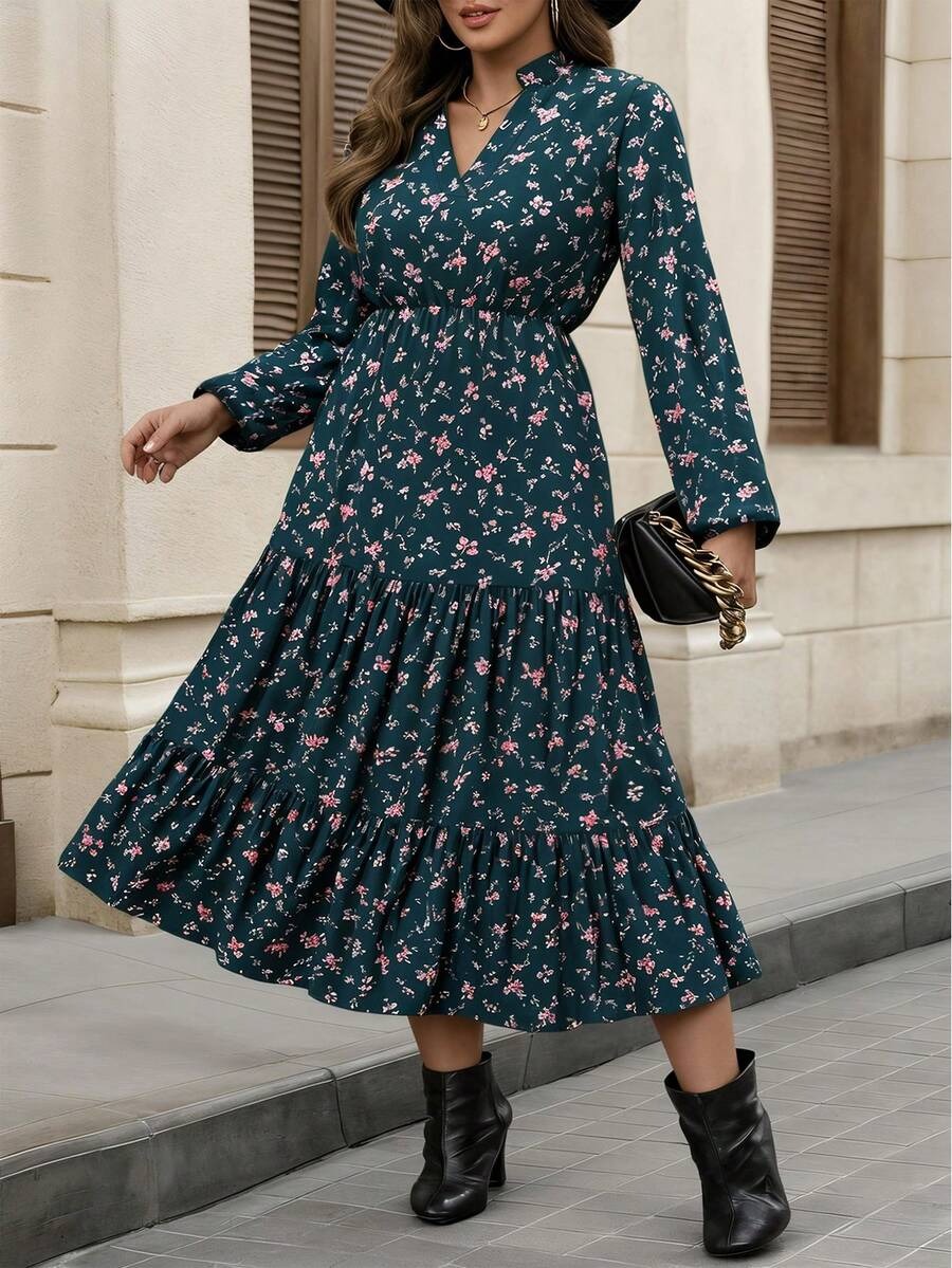 Rochie Lunga Cassie Turcoaz cu Print Floral Roz – Marimi Mari