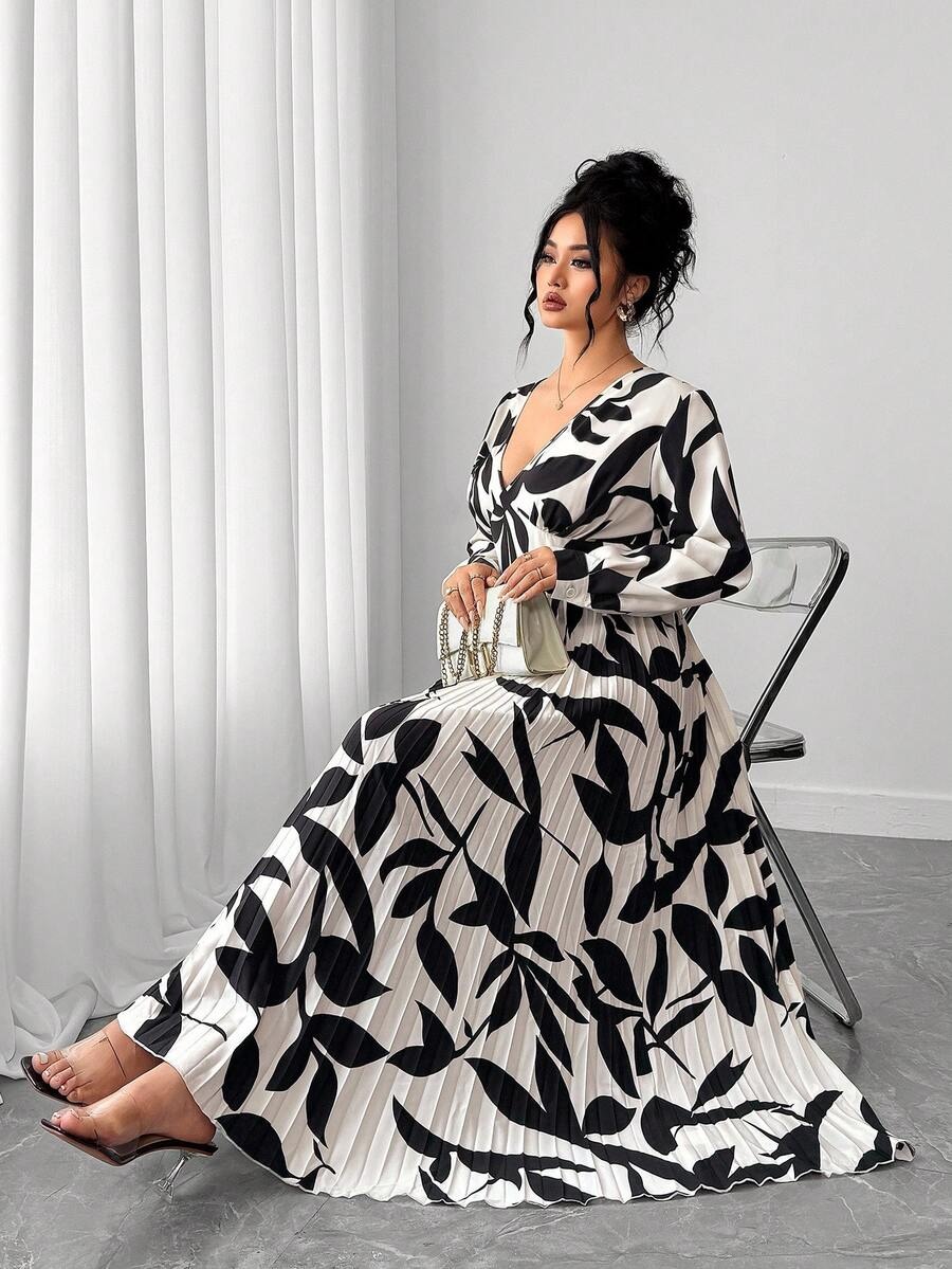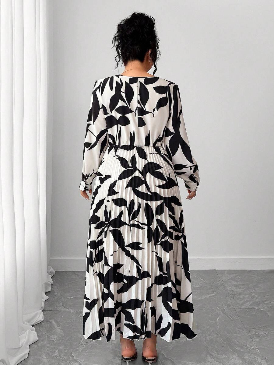 Rochie Lunga Catinca Alba cu Print Negru Plisata – Marimi Mari
