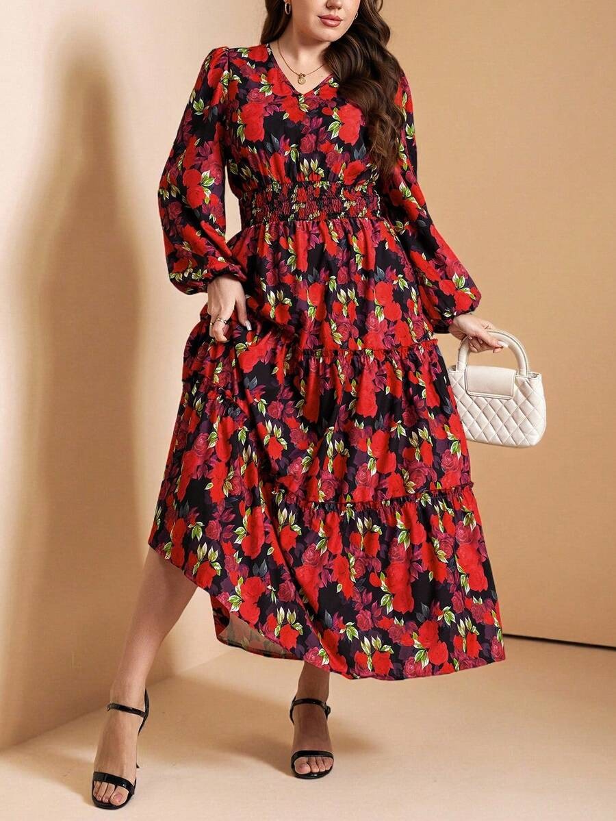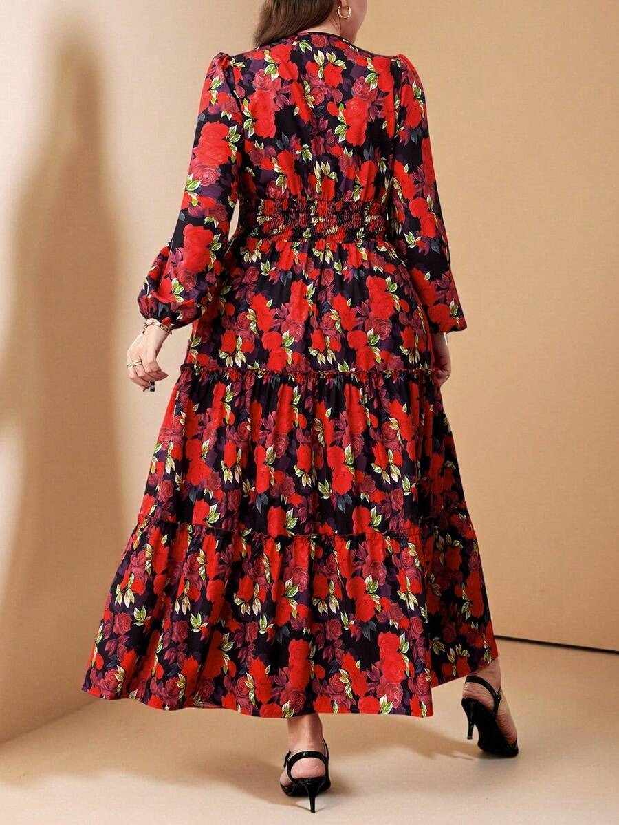 Rochie Lunga Cory Neagra cu Print Floral Rosu – Marimi Mari