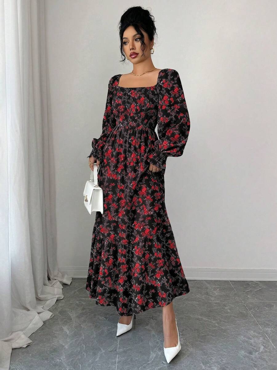 Rochie Lunga Elvira Neagra cu Print Floral Rosu