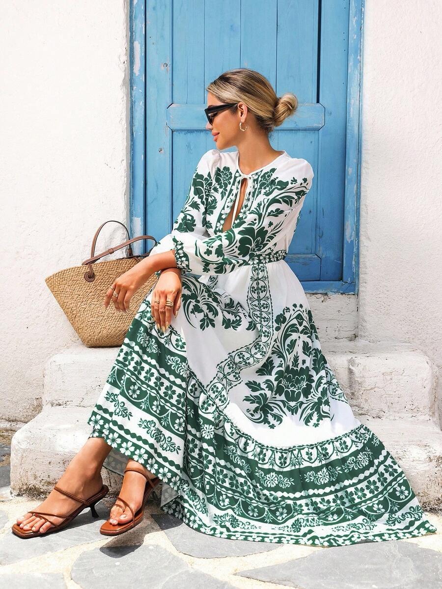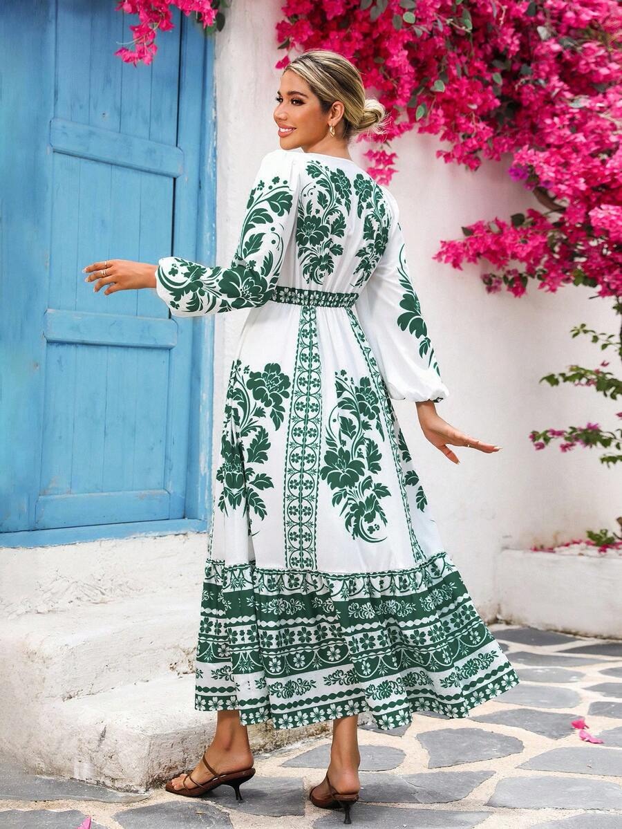 Rochie Lunga Emina Alba cu Print Verde