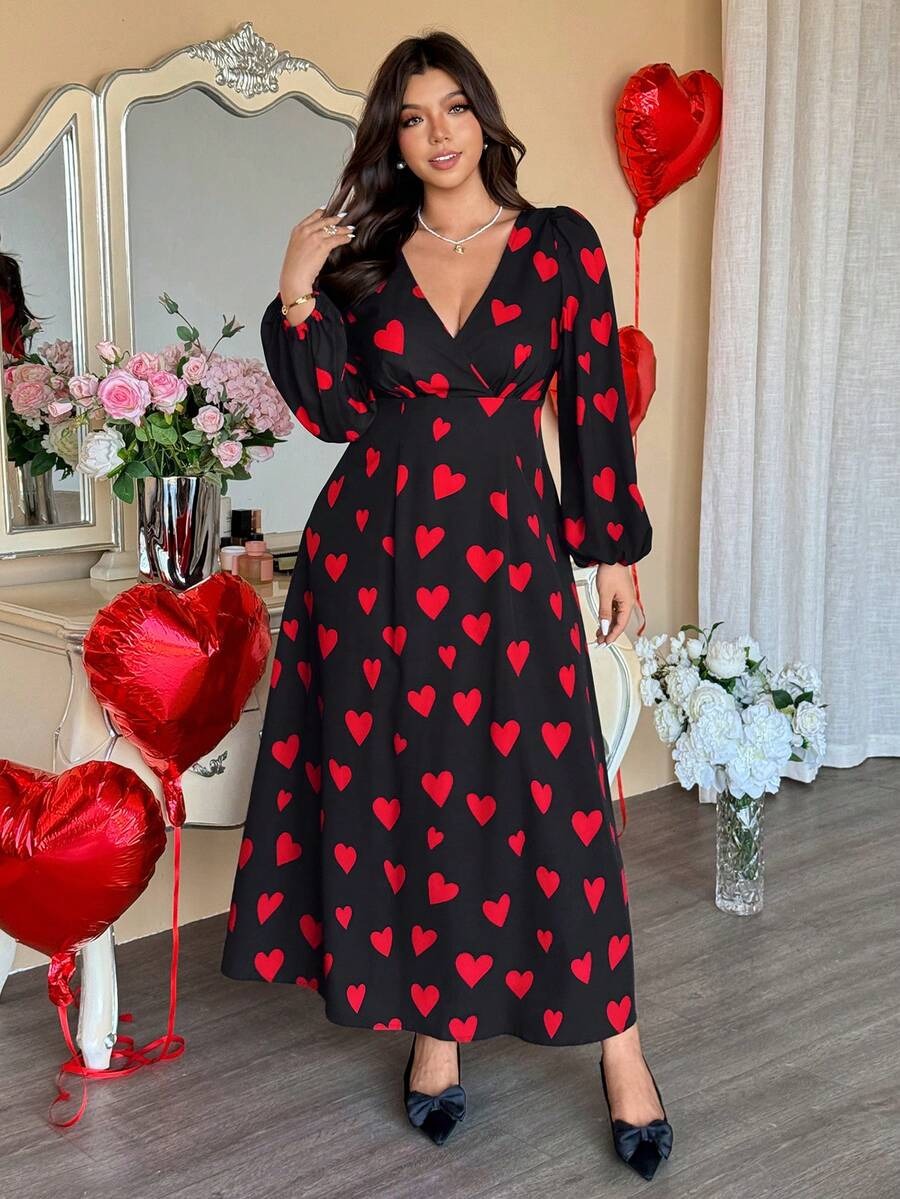 Rochie Lunga Emma Neagra cu Inimi Rosii – Marimi Mari