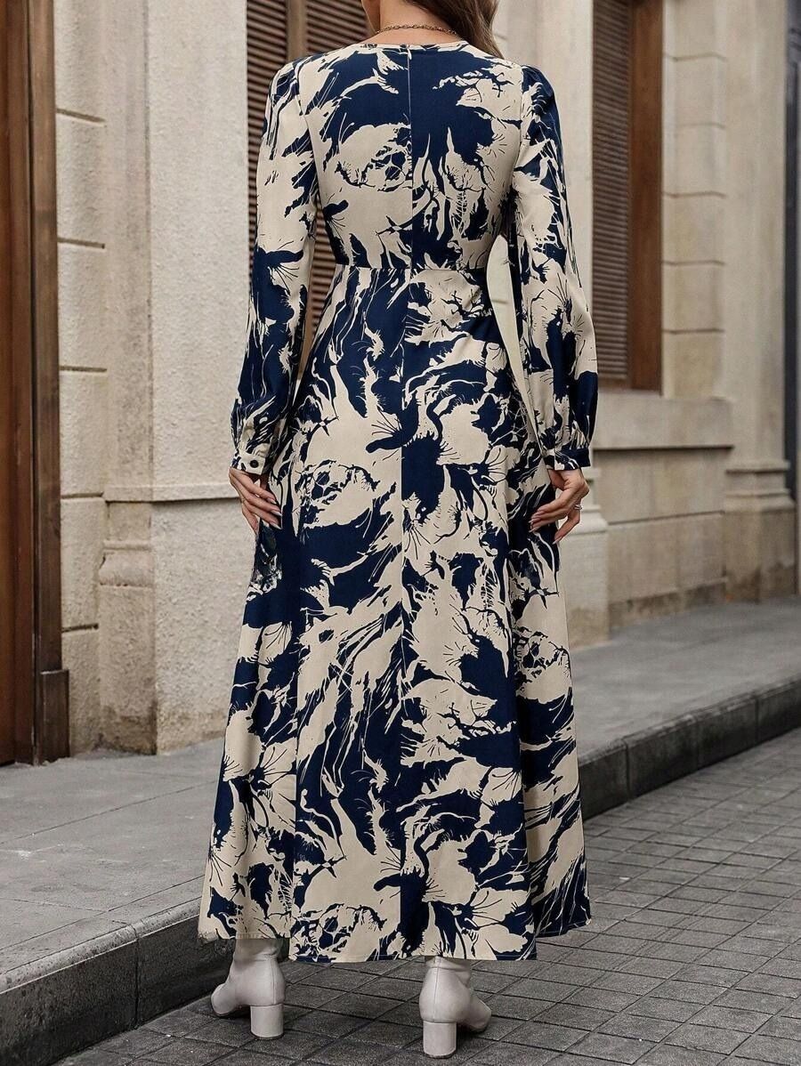 Rochie Lunga Faustina Crem cu Print Bleumarin
