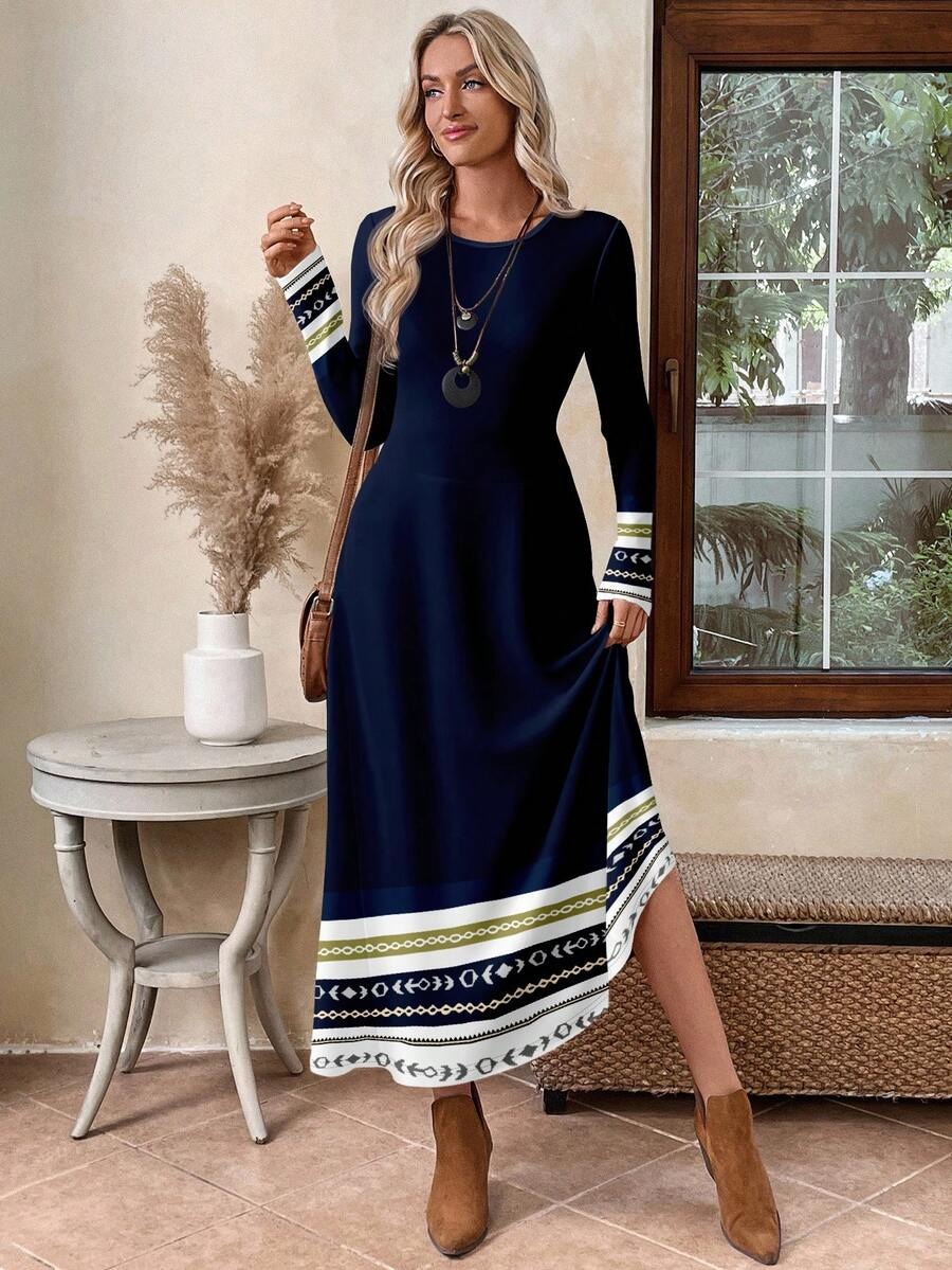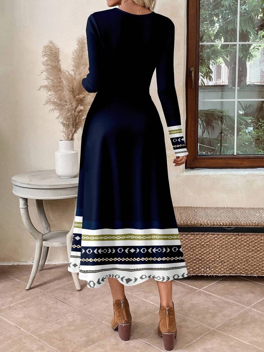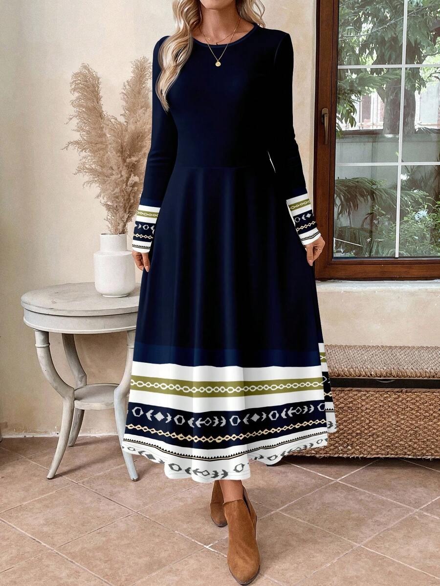 Rochie Lunga Galatea Bleumarin cu Print Geometric