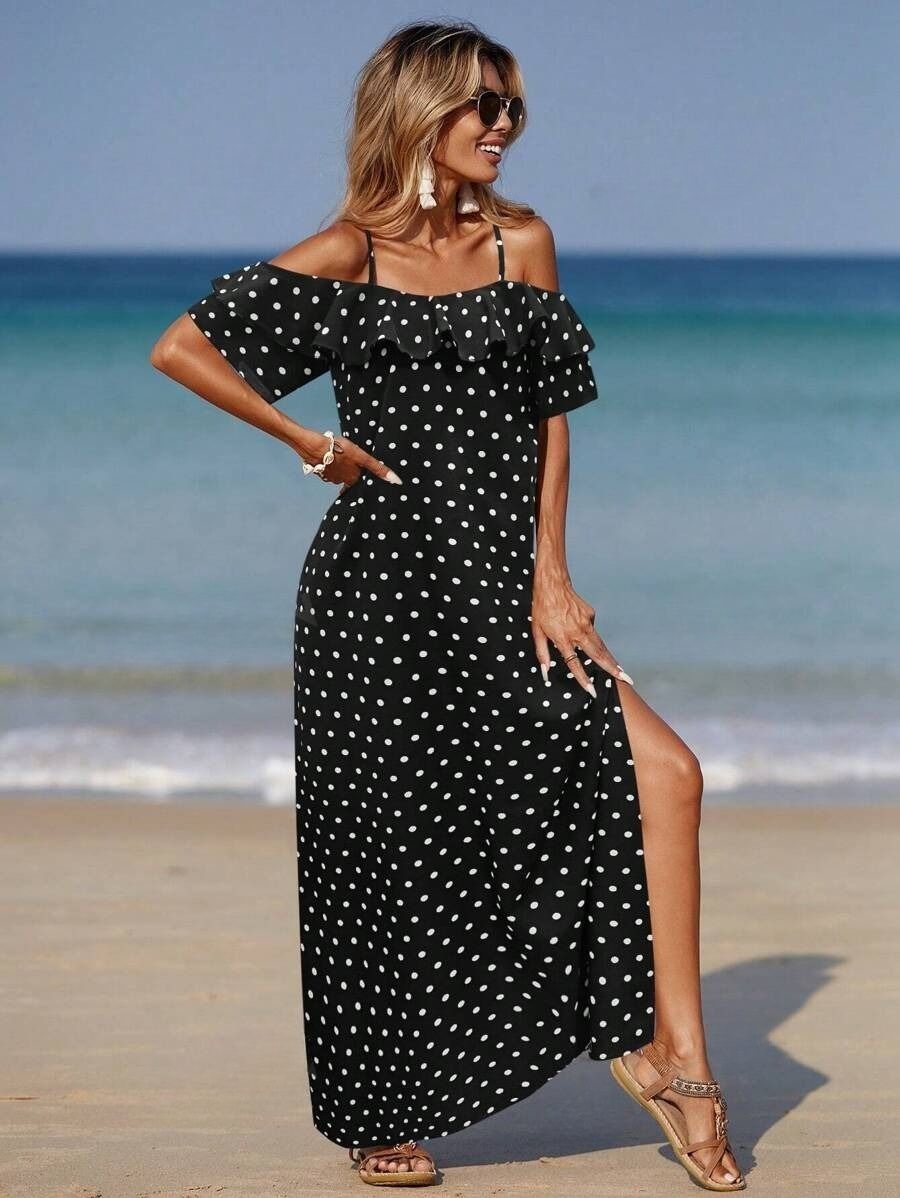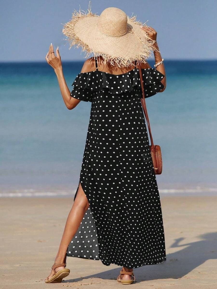 Rochie Lunga Gaspa Neagra cu Buline Albe