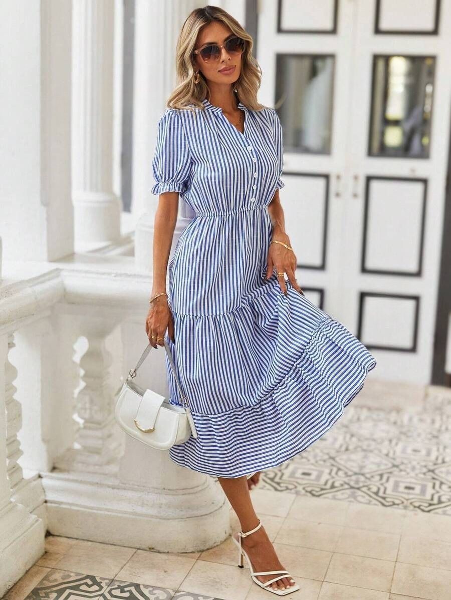 Rochie Lunga Janette Alba Cu Dungi Albastre