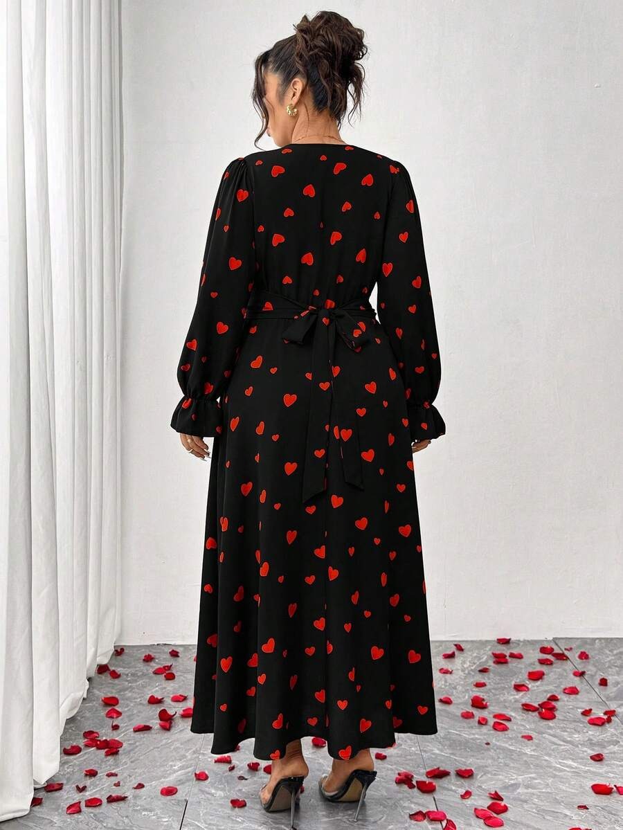 Rochie Lunga Jonina Neagra cu Inimi Rosii – Marimi Mari