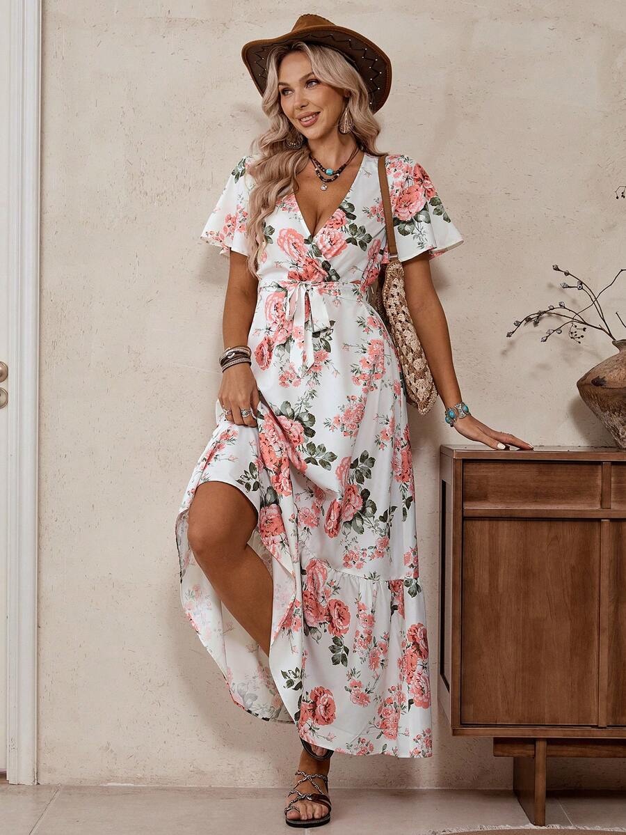 Rochie Lunga Kaida Alba cu Print Floral Roz