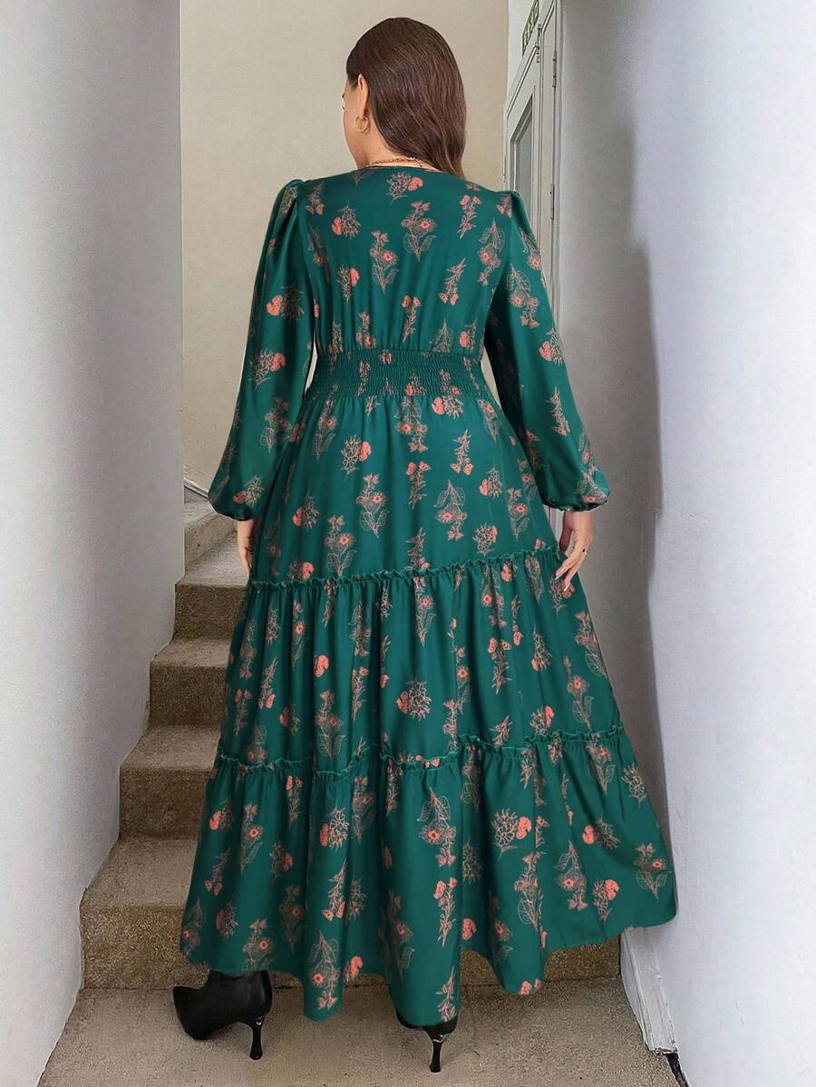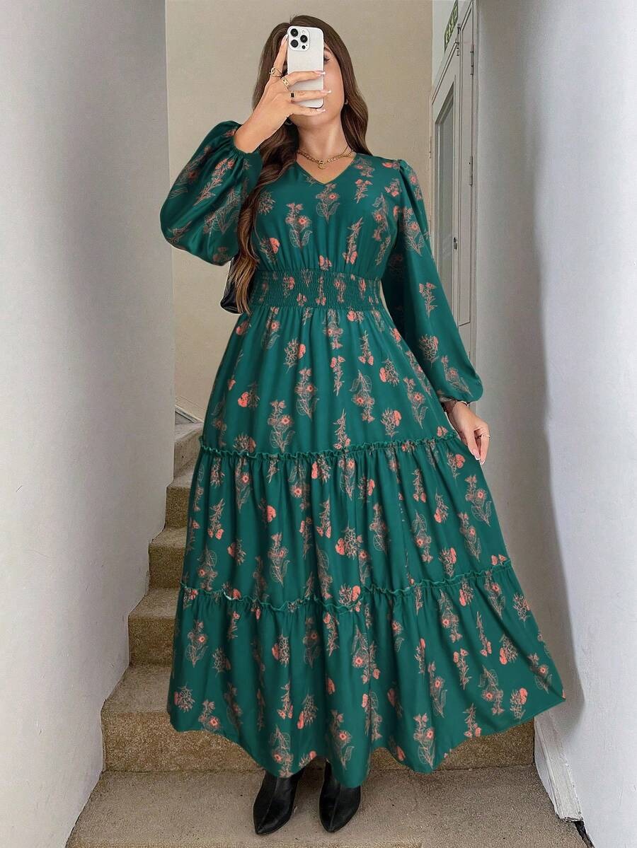 Rochie Lunga Kalia Verde cu Print Floral Caramiziu – Marimi Mari