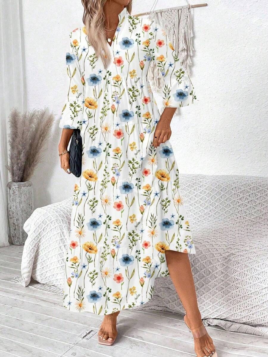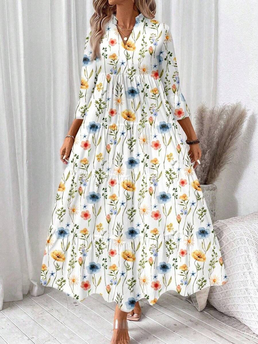 Rochie Lunga Melania Alba cu Print Floral Multicolor