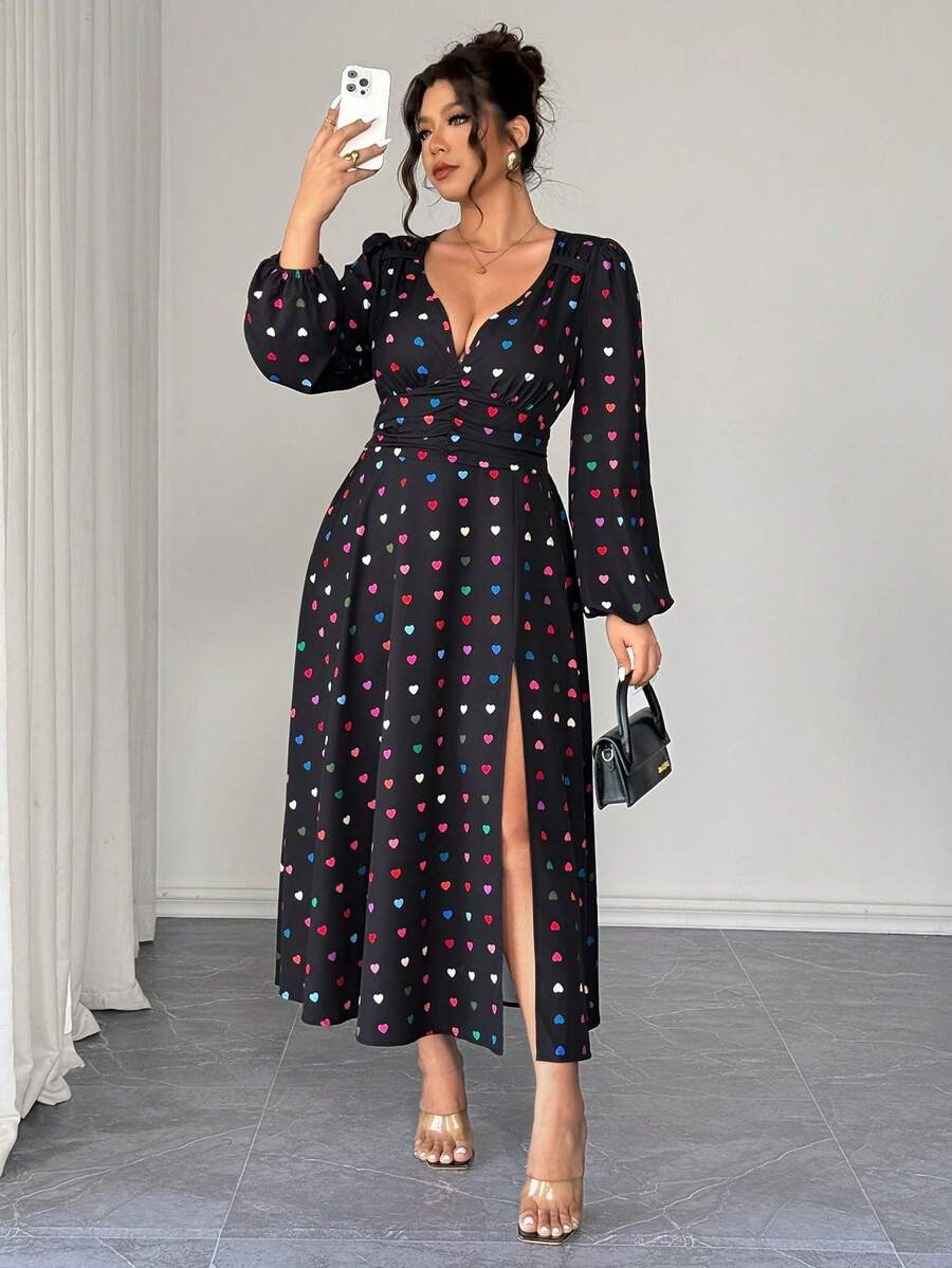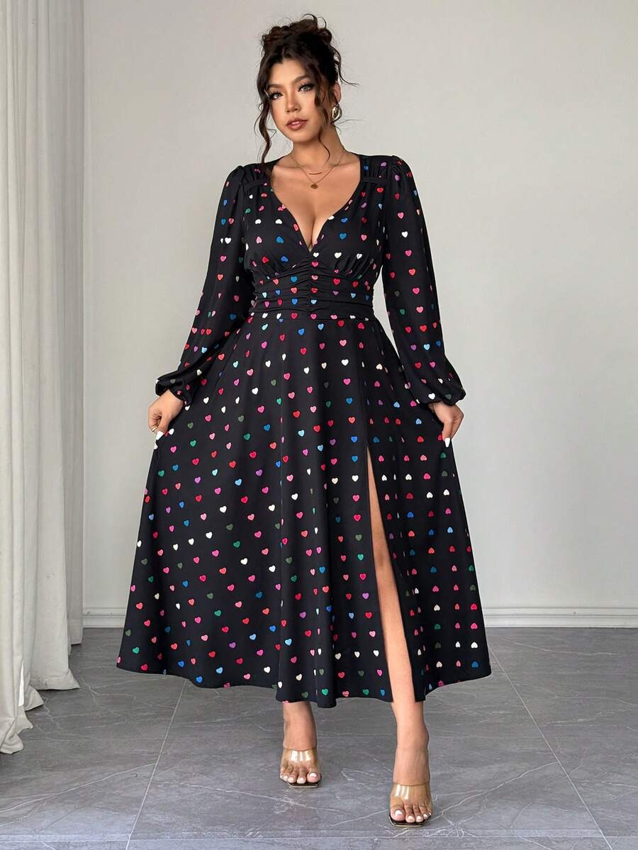 Rochie Lunga Melania Neagra cu Inimioare Multicolore – Marimi Mari
