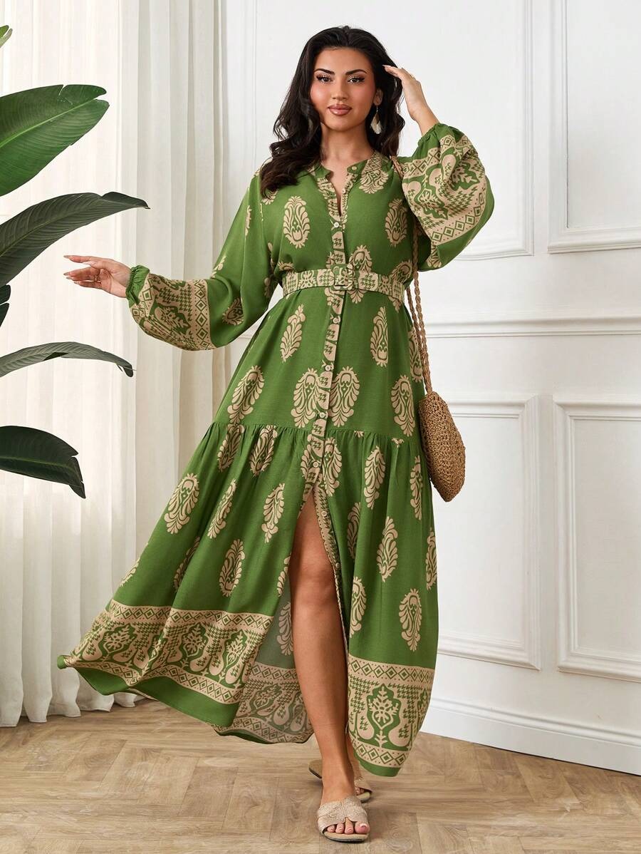 Rochie Lunga Minke Verde cu Print Bej